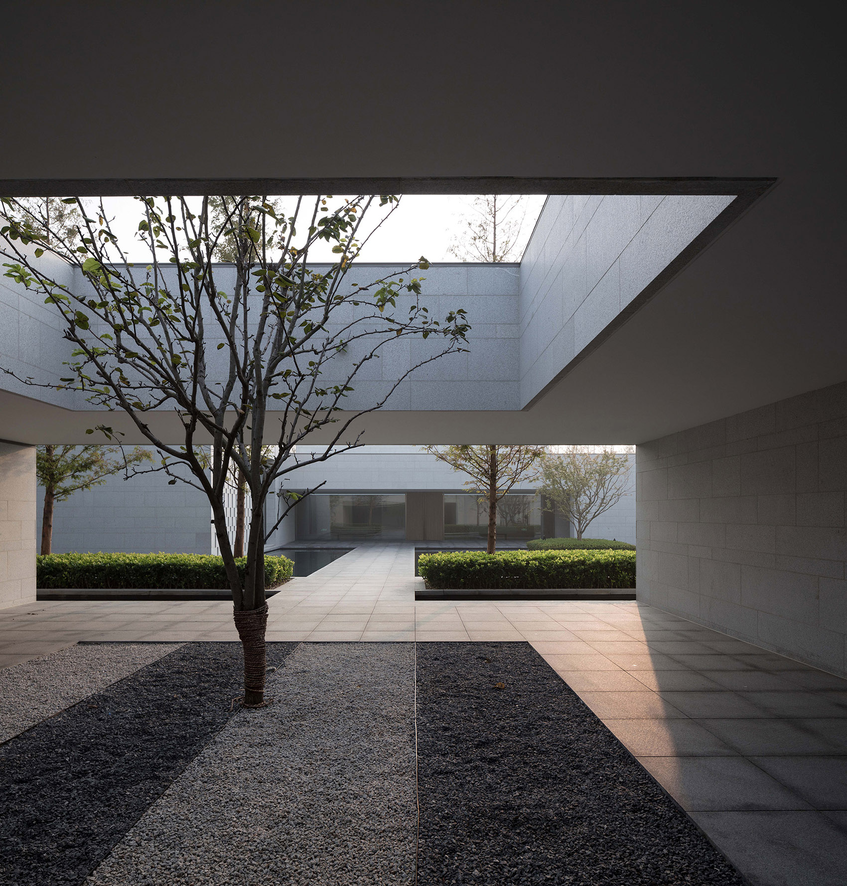 建筑采用简洁的几何轮廓,水平系统的控制线带有强烈的人工感,衬托出杉树挺拔的剪影。低平的天际线在中心水院中形成倒影,天空在水中呈现镜像,给人以格外开阔的感受,与入口处迂回的路径形成对比。