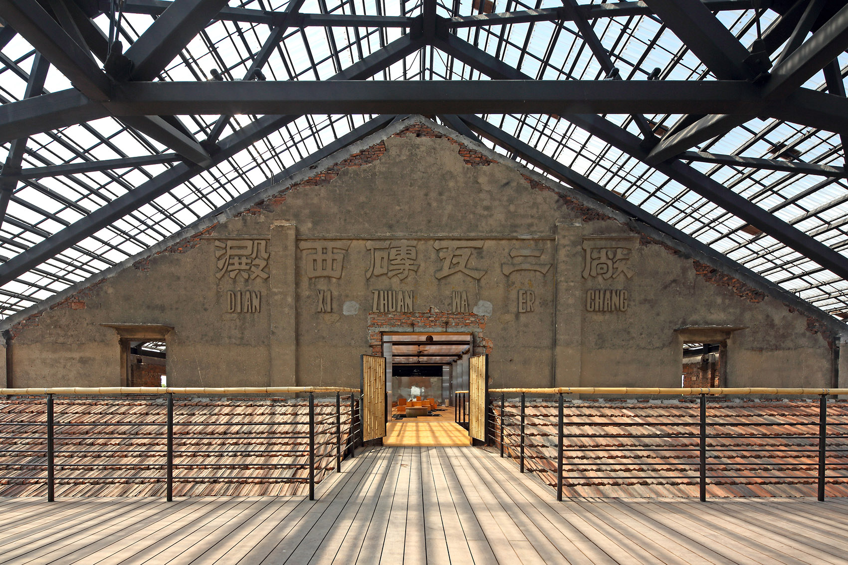 而其他卫生间和机房被隐藏在两个镜面小盒子中。第一次进入砖厂时,我们都被屋顶残破的景象所震撼!为了再现当年的场景,同时为了尽量降低屋面荷载,课题组订制模具,并设计了透明瓦,透明瓦非常轻,用螺栓固定,可以减轻屋面重量,同时形成意想不到的效果。