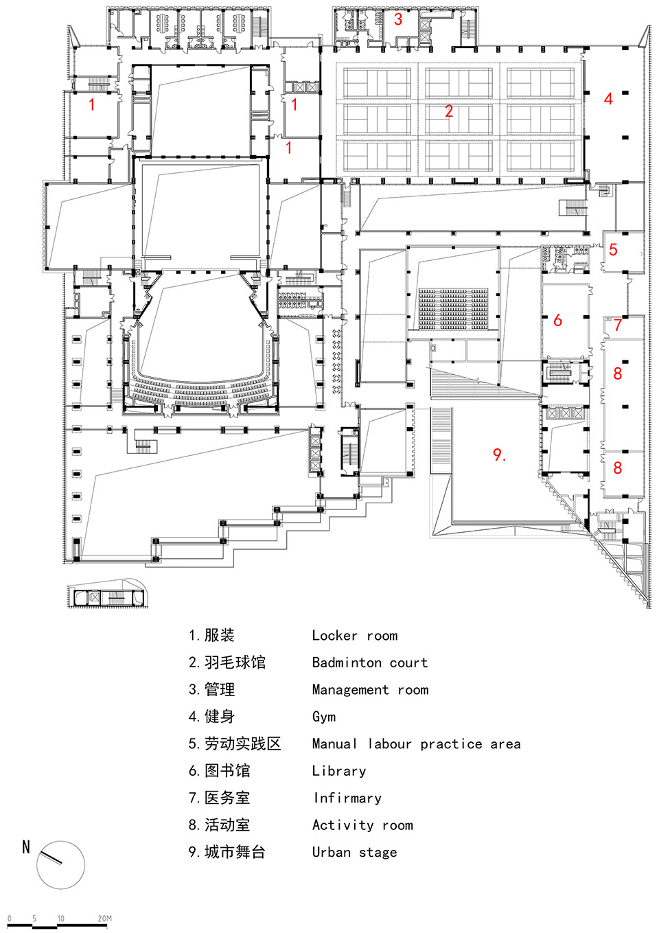 传承中国传统建筑中以庭院为中心的营造传统,本项目中建筑的中心不是宏大的厅堂,而是由下沉广场通过坡道、大台阶蜿蜒至屋顶花园的立体庭院,其中的空间与动线组织,起承转合,步移景异,也是对中国传统园林空间组织手法的学习和发扬。剧院、健身中心、青少年宫三大功能区块围绕立体庭院呈合院展开,合院的第四面则是巨大的主入口空间。主入口巨大屋顶如云垂天际,入口下巨大的灰空间正是源于戏台、祠堂等江南传统的公共空间模式,十分适合江南地区的公共文化活动要求。大屋顶下的城市舞台最为市民所喜爱,这里遮风避雨又视野良好,可同时欣赏到美丽的义乌江景与都市的繁华,每天清晨都有市民专程到此健身、运动、休憩。大屋顶檐下抽象的红色叠涩造型,既像舞台的帷幕又像宫殿的斗拱,体现出浓郁的东方文化气息。红色的金属幻彩板是设计师为本项目特别定制的“义乌红”,其特点是:平常为朱红,在特定的光线角度下却呈现出灿烂的金黄色。“义乌红”隐喻着义乌可以为世界各地商旅提供发现财富、实现梦想的机会,到义乌文化广场寻找那一抹“金色”,已经成为参观者经常参与的趣事。