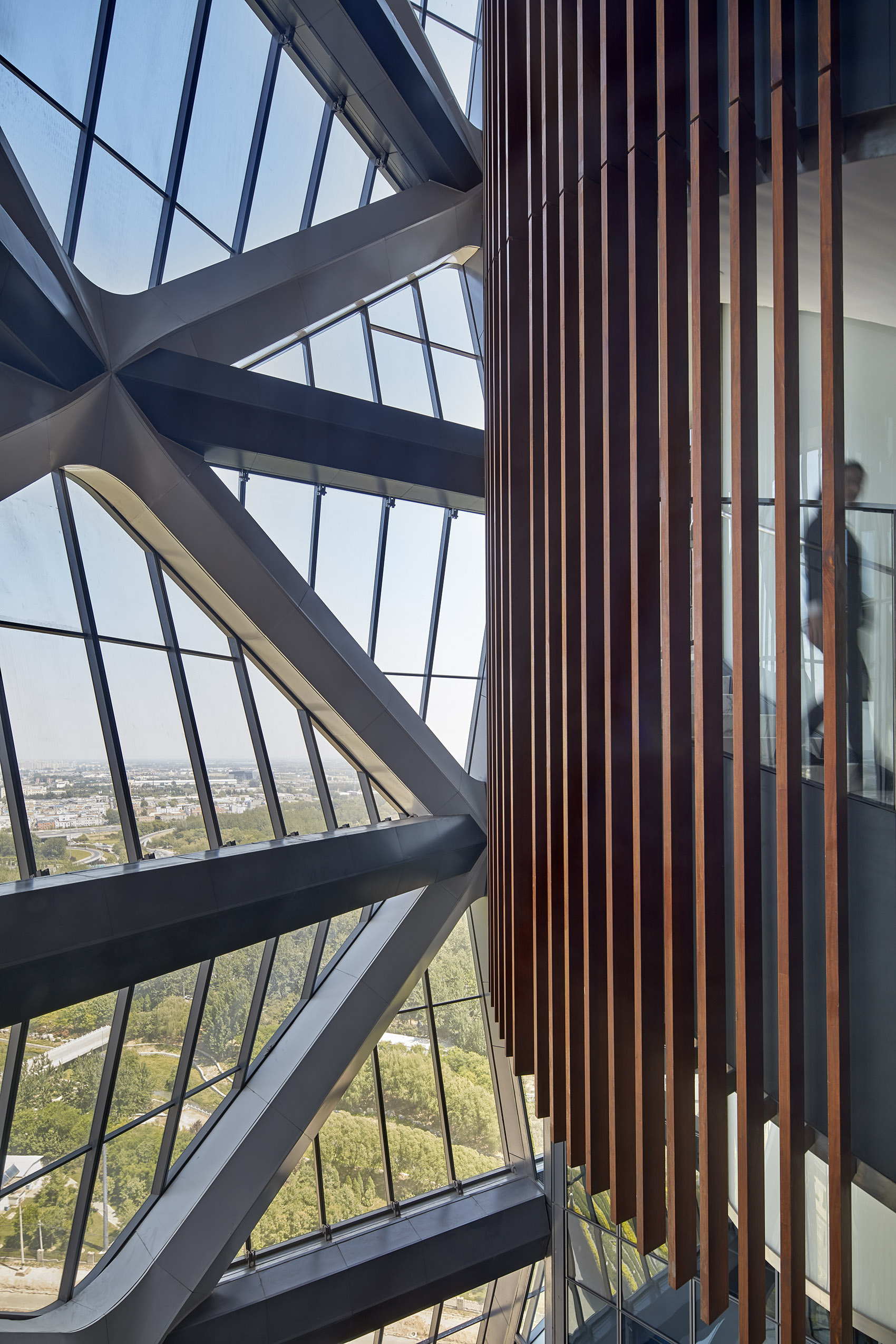 主楼的外观设计受中国纸灯笼启发,在构成图案的连续斜肋框架上安装宝石切割面造型的玻璃幕墙,让立面上天空浮映,日辉闪烁。外框架结构体系形成外层保温墙体,内层玻璃墙体之内才是办公空间。这一设计提供了自然光照的公共区域,可用于会议和社交互动,同时也构成楼层之间的空间和视觉联系。大跨度的结构设计,不仅提供广阔的内部空间,可营造无柱工作环境,而且还采用了具有高度可持续性的建筑/暖通方法来应对北京特有的气候和空气质量的挑战。