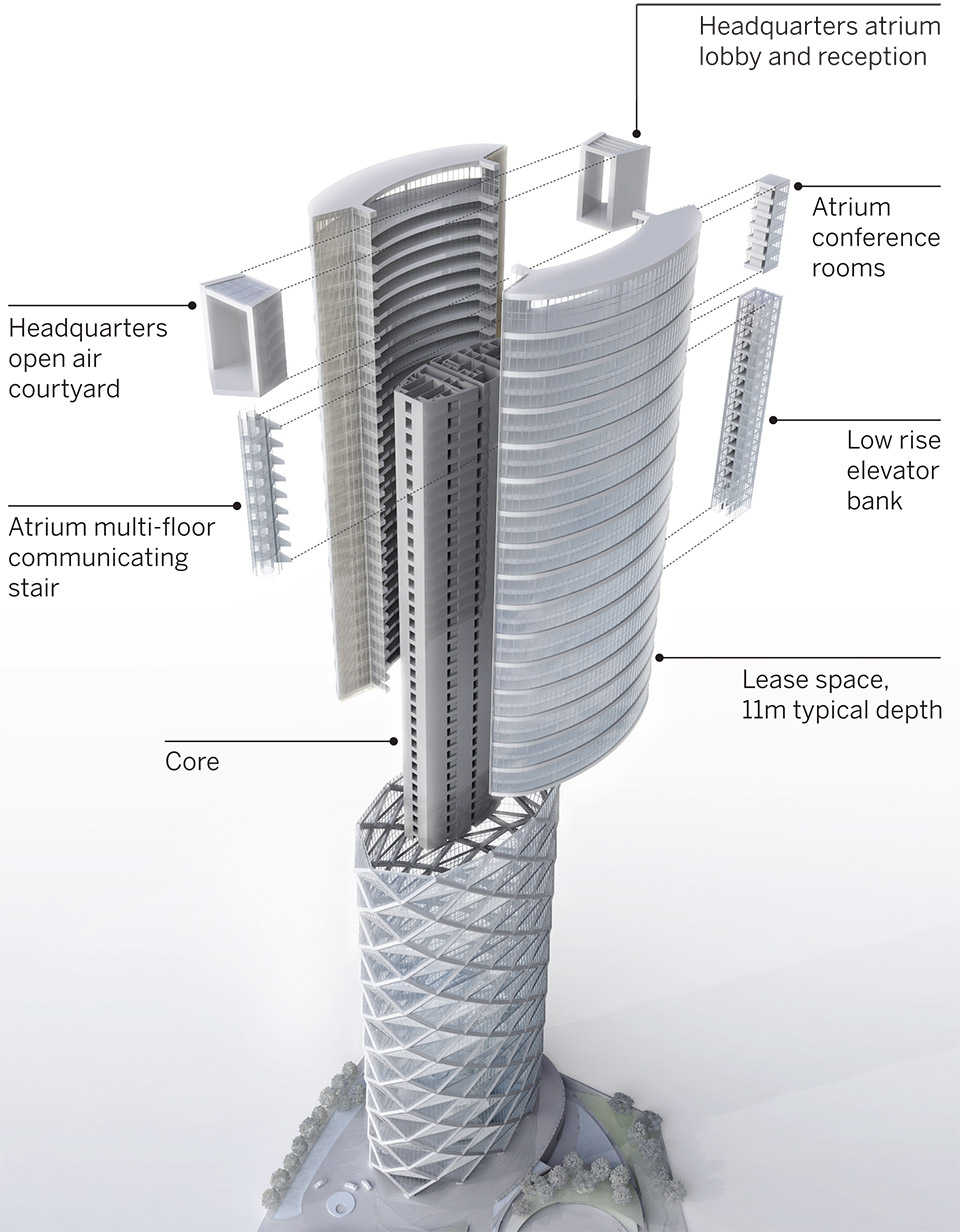 ▼建筑外观表现为宝石切割面造型的玻璃幕墙, main tower’s exterior is formed by a continuous diagrid pattern, with a jewel-like faceting