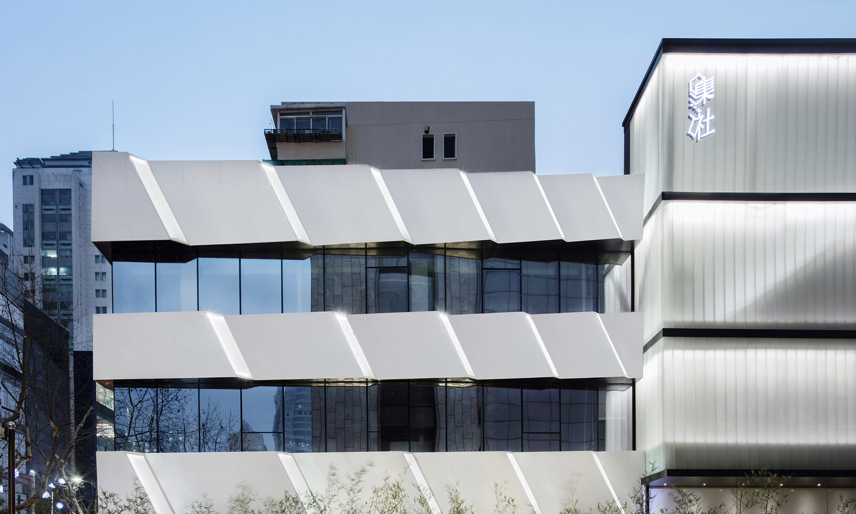 设计以由外及内的关系推演为切入点,强调塑造转角建筑的体量感。钢板与U型玻璃一实一虚,前后呼应,承担了限定体量与模糊边界两种功能——在人行视角,前端起伏的介质呈现明确的体积感,后部半透明的轻盈带来边界的不确定性。透过行道树的映衬与遮蔽,起伏流动的转角以建筑语言重构。梧桐的季节变化被镀膜玻璃以倒影形式引入,消解了立面的纵向连续感,钢板造型的流动特征得以强调,藏在深处的入口由此具备向心力。设计概念正以此方式,激发场地活力。
