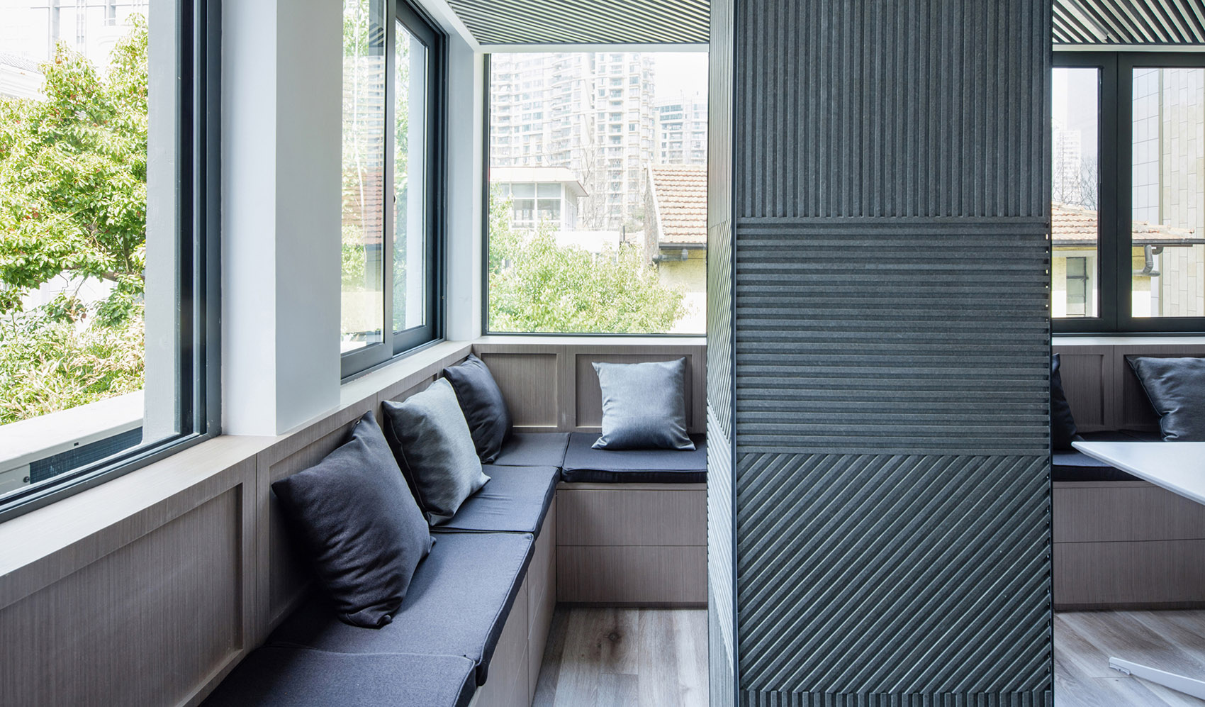 独立房间的半透玻璃缓解了墙体围合带来的压力,将室内活动映射到公共区域,这种通透感也正是创意联合办公的重要属性。