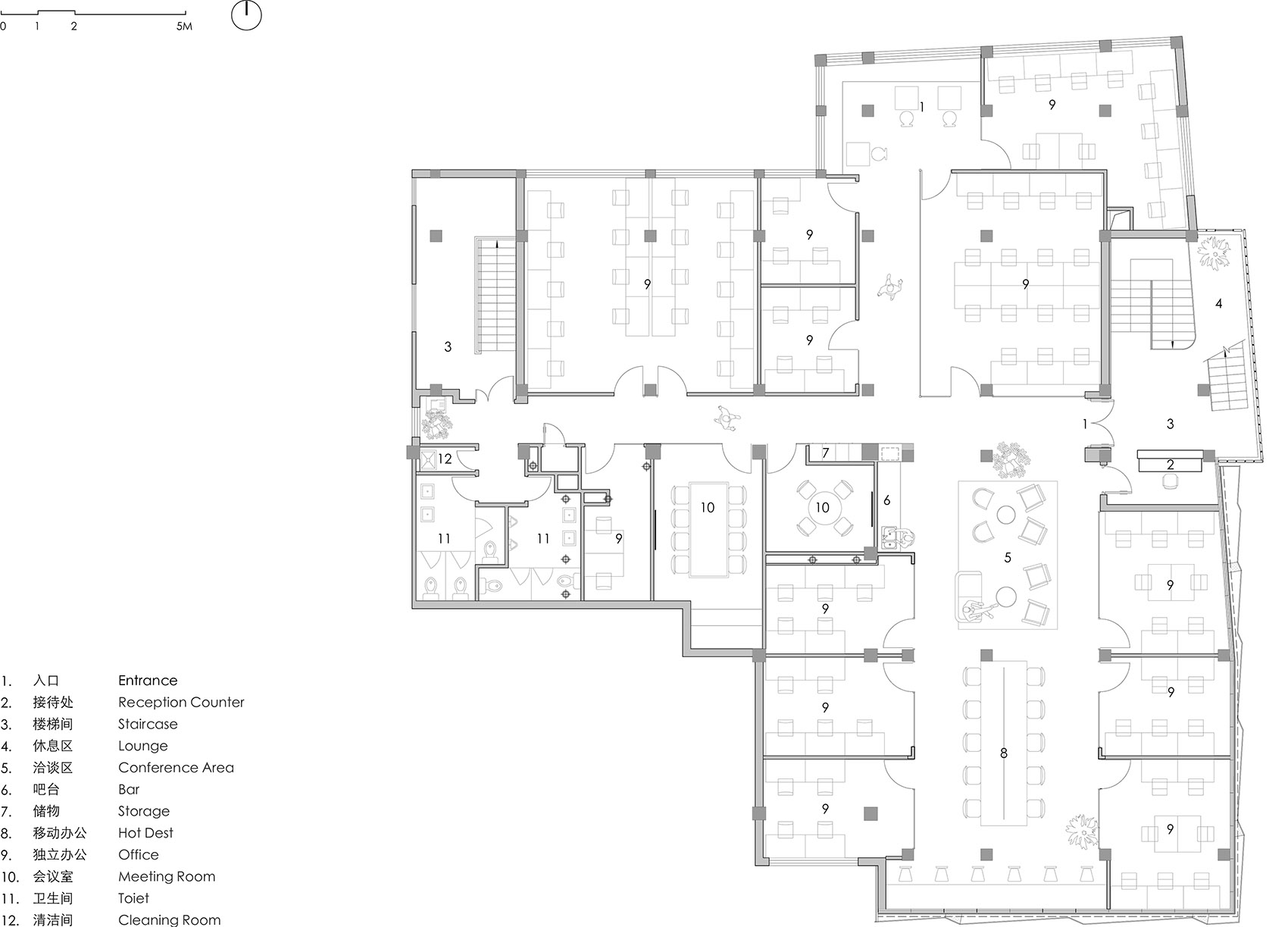 室内层高极低,因此公共部分选择裸顶以充分利用现有高度,配合金属、玻璃、浅色自流平地面,使硬装部分呈现冷硬利落的效果,而植物与家具的置入又给使用者提供新一层次的体验。三层作为联合办公,具有多种复合功能属性,人们经半开放的独立办公区走出,在流动的公共空间,开始一段谈话,或者驻足观看被引入室内的风景。