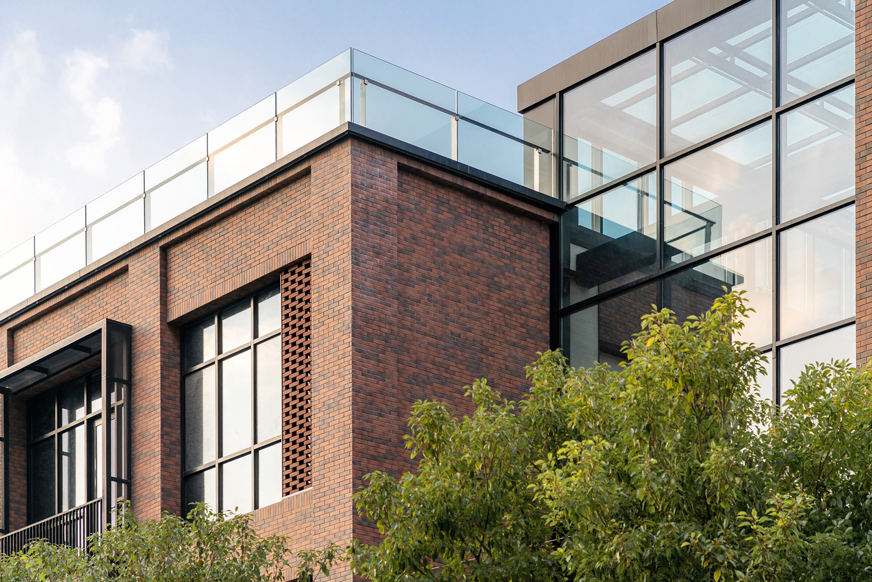 为保留建筑原有的风貌,并满足现代商业与办公的采光需求,设计师将立面在原有基础上重新划分。以深红色砖块为元素,结合多种拼砌工艺,强调出新老建筑的延续与呼应。凸出的金属阳台,为平整的立面增添了跳跃的元素,使建筑更富工业感。