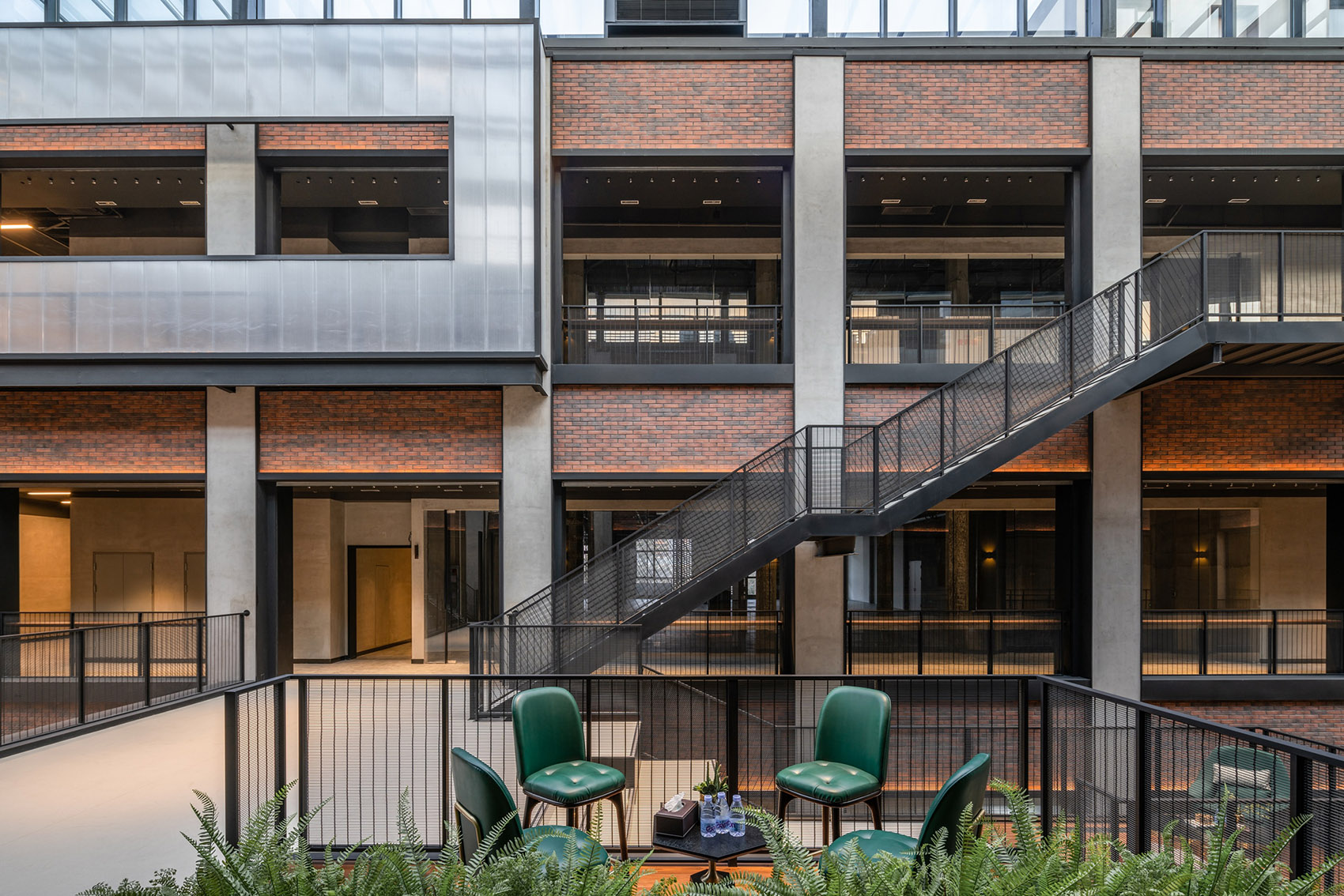 将建筑立面上材料与空间交错的设计语言延用到中庭当中,新旧材料交替及光影对比贯穿整个空间,增强层次感和舒适度。