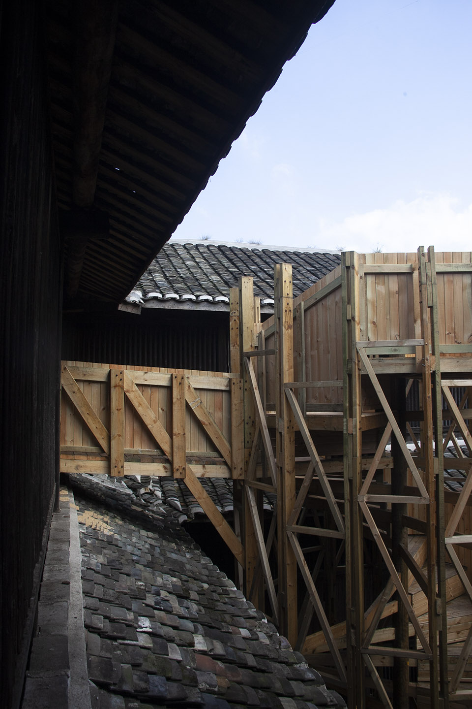 拥有500年历史的土楼外廊结构的重要性则体现在这座新的高12米的木塔上。新旧结构之间的连续木栏杆由环绕着一根中央立柱的螺旋楼梯连接起来,每层土楼则由一系列桥梁与楼面相连。与“插件Plug-In”一样,该结构也同时面向外部空间。 铺面板沿着台阶放置在栏杆的内部,而最后一级台阶与内部屋顶的屋檐维持同一水平高度,从而形成了一个可以供人们端坐在土楼宁静且受遮蔽的庭院内观赏土楼外地平线风景的平台。