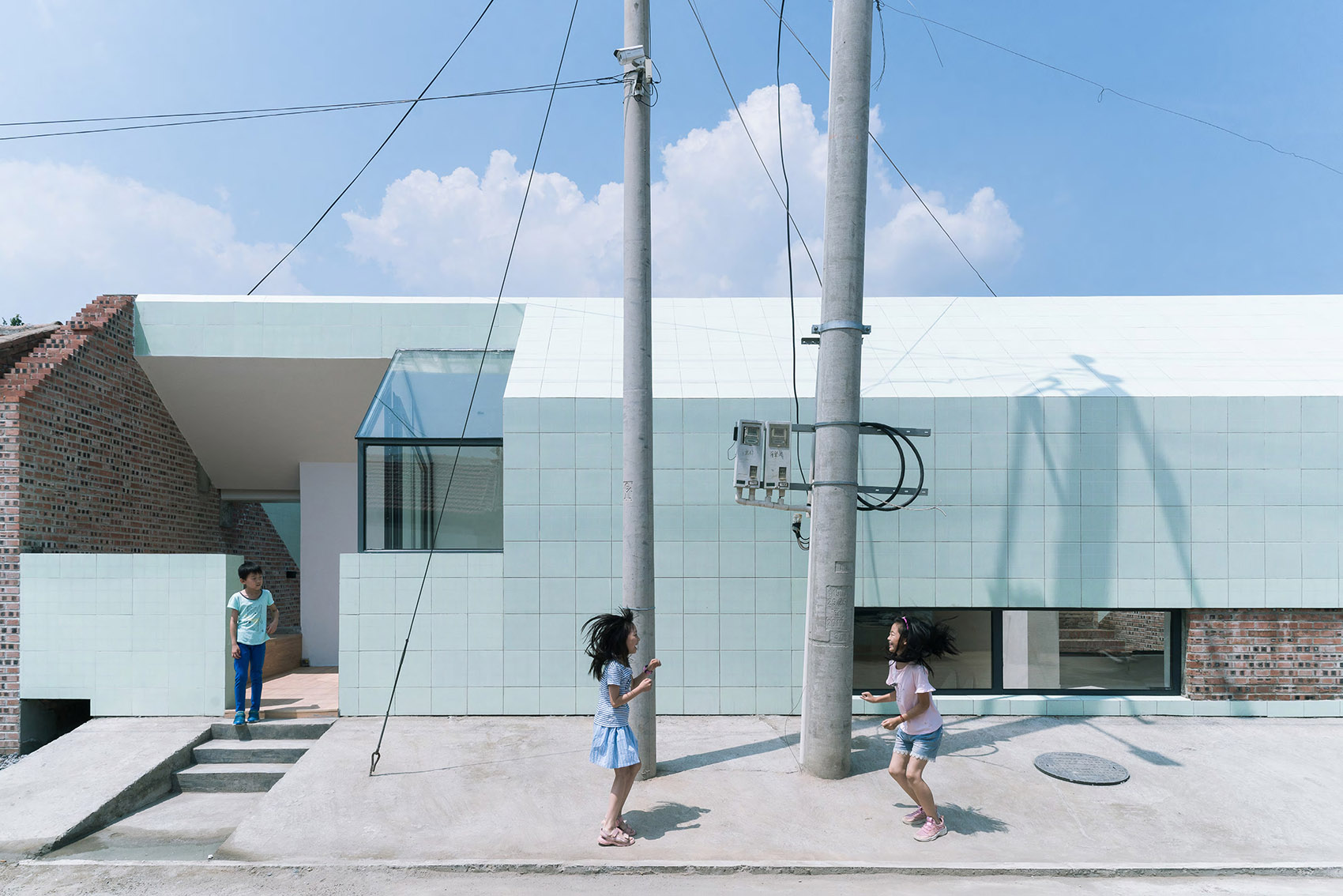 关于材质的“交互”的表达,我们希望能够延续红砖绿窗的记忆。瓷砖这种华北乡村常见的建材表达了村民清洁卫生的朴素需求,我们既不想为了“建构”欲望而刻意暴露真实建筑材质,也并非要“民粹”般地歌颂流行乡间的大白瓷砖,“天青色”的瓷砖被选作南房的表皮, 瓷砖绿和砖红形成“大俗”撞色,却充满了火热的生活质感。