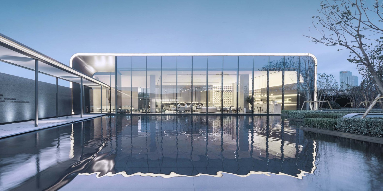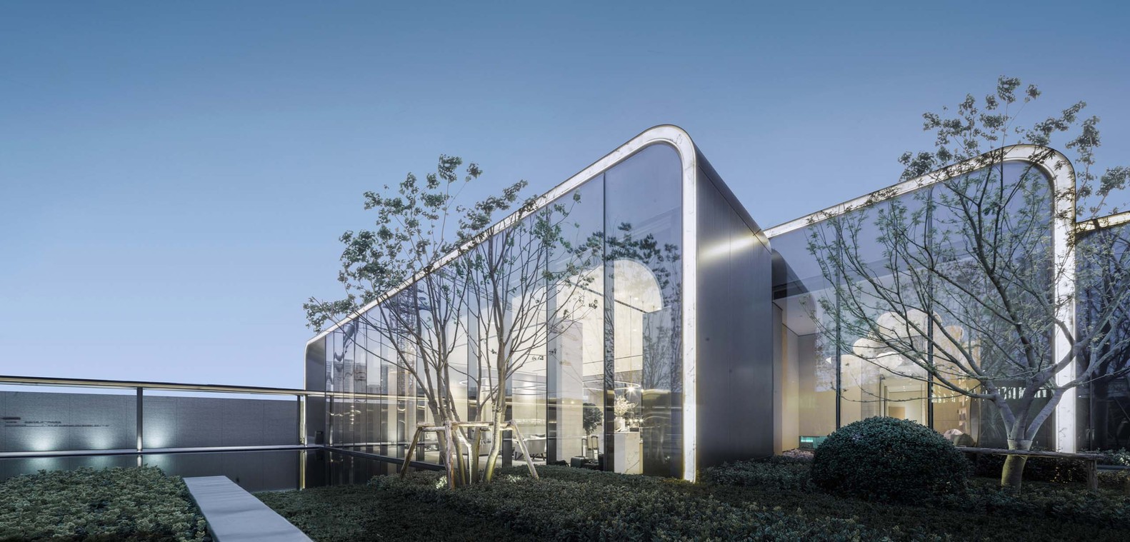 在立面上,采用标准化预制构件实现了iphone标志性的圆角曲线,动感、圆弧的流线,整体立面犹如微边框数字全屏,顺应科技美学的当代趋势。外边缘采用超薄的蜂窝铝板包裹石材肌理的亚克力板,暗藏有LED灯,夜晚透光,大面积超白玻璃幕墙与水环境叠加,强化超流体建筑的反重力感。