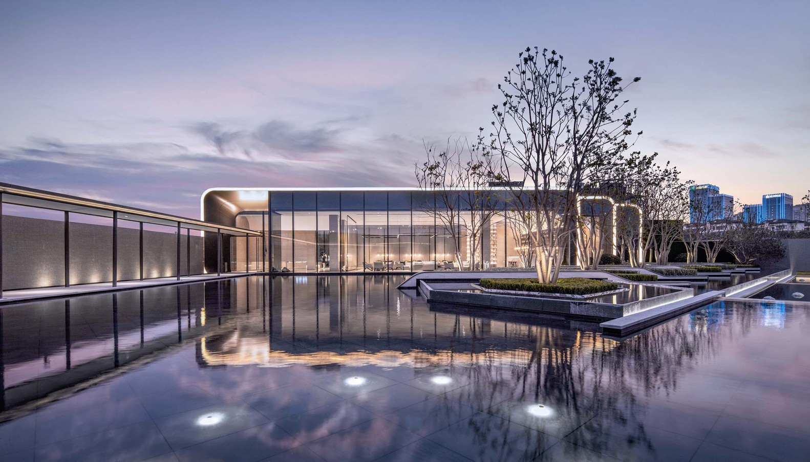 隐于城市一隅的主入口,借压低延展的顶棚界定空间形成隐秘感;转而是拾级而上的石板阶梯,布有山石绿植,以此为历史意象;转折后的邻水廊道选用深色吊顶石膏板,以简洁的线条指向未来;而折点处的接待中心也就成了“空间站”,衔接和缓冲两段连续时空。生活馆内同样经过巧妙设计的折形动线,为室内多样化的活动提供空间支持。