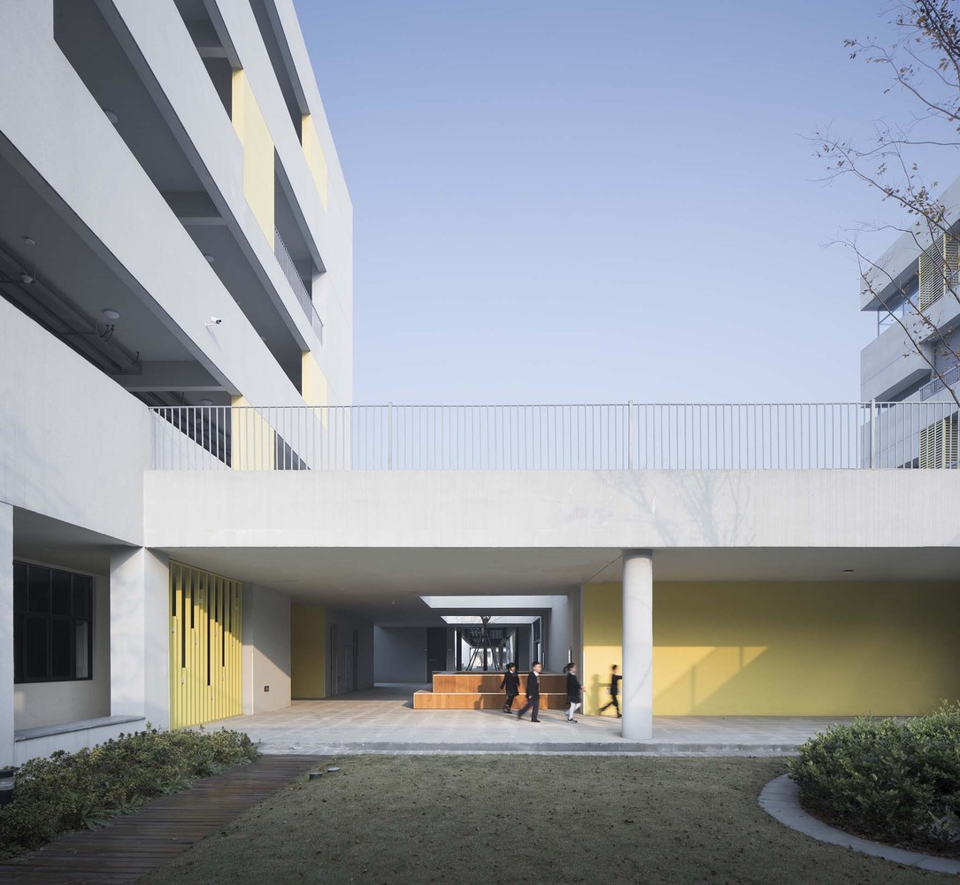 为了让阳光照在每个孩子的书本上,在建筑密度较大的情况下,我们将专业教室等功能布置于一层,与虚体的院落和放大的公共区域共同塑造空间的趣味感。而普通教室按年级分栋,坐落其上,营造空间归属感,整个校园由二层平台连为一体。平台之下,曲径通幽。平台之上,肆意奔跑。