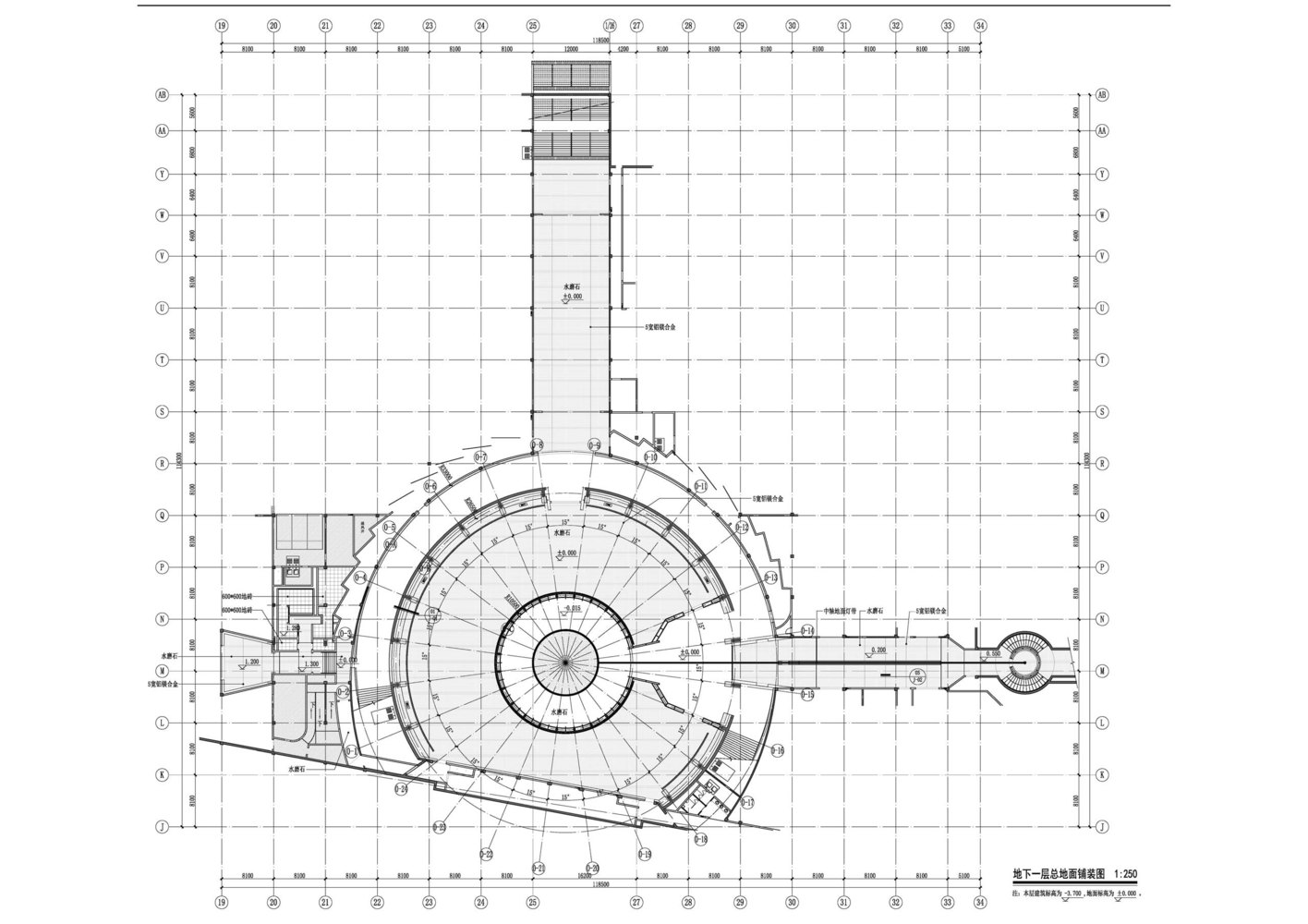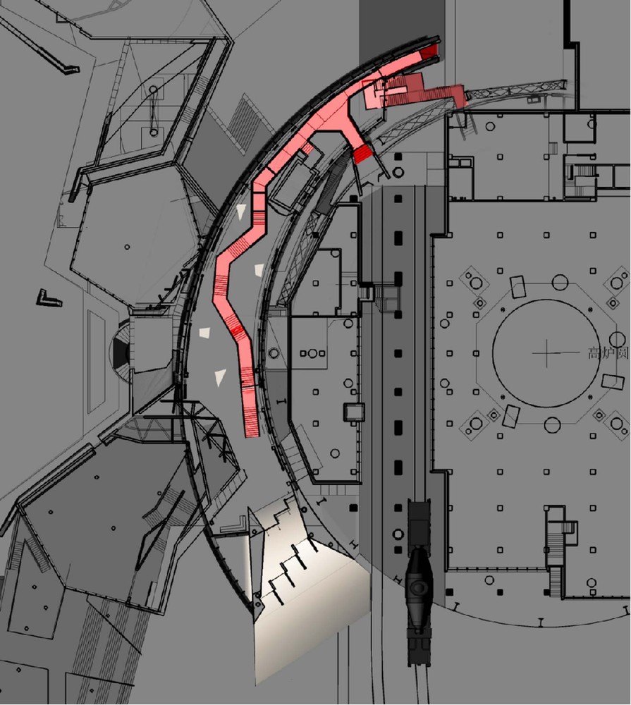 “钢与火的穿越重生。”----剧本大纲设定为炼钢意象与钢水奔涌的穿越场景。水下展厅位于首钢园的秀池中央,沉隐于水面之下,室内中轴线由水下展厅,甬道和功勋柱组成。水下展厅空间主体是清水混凝土的大构建,中心点是圆形天井,与通透的中庭形成质感上的强烈对比。