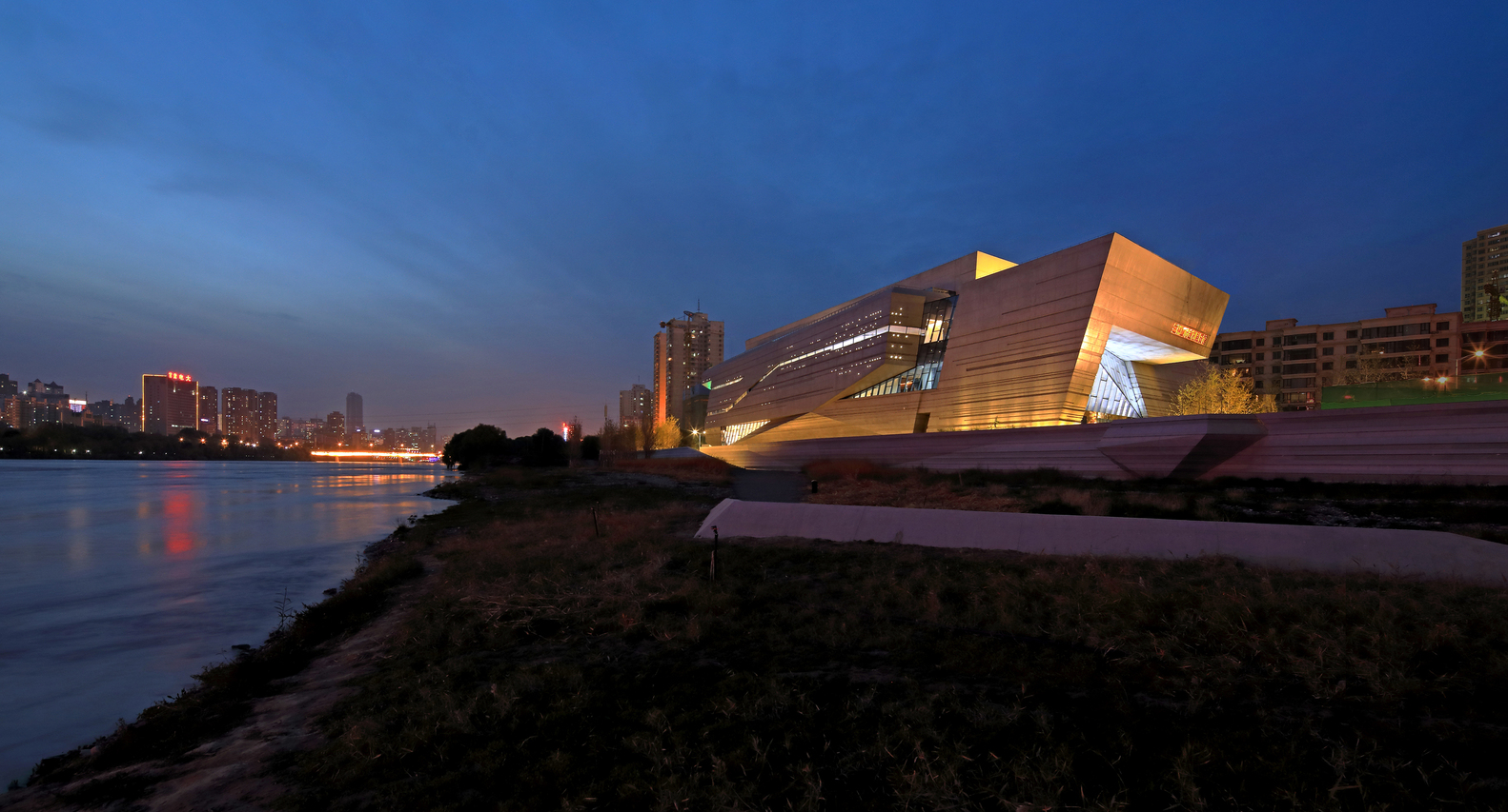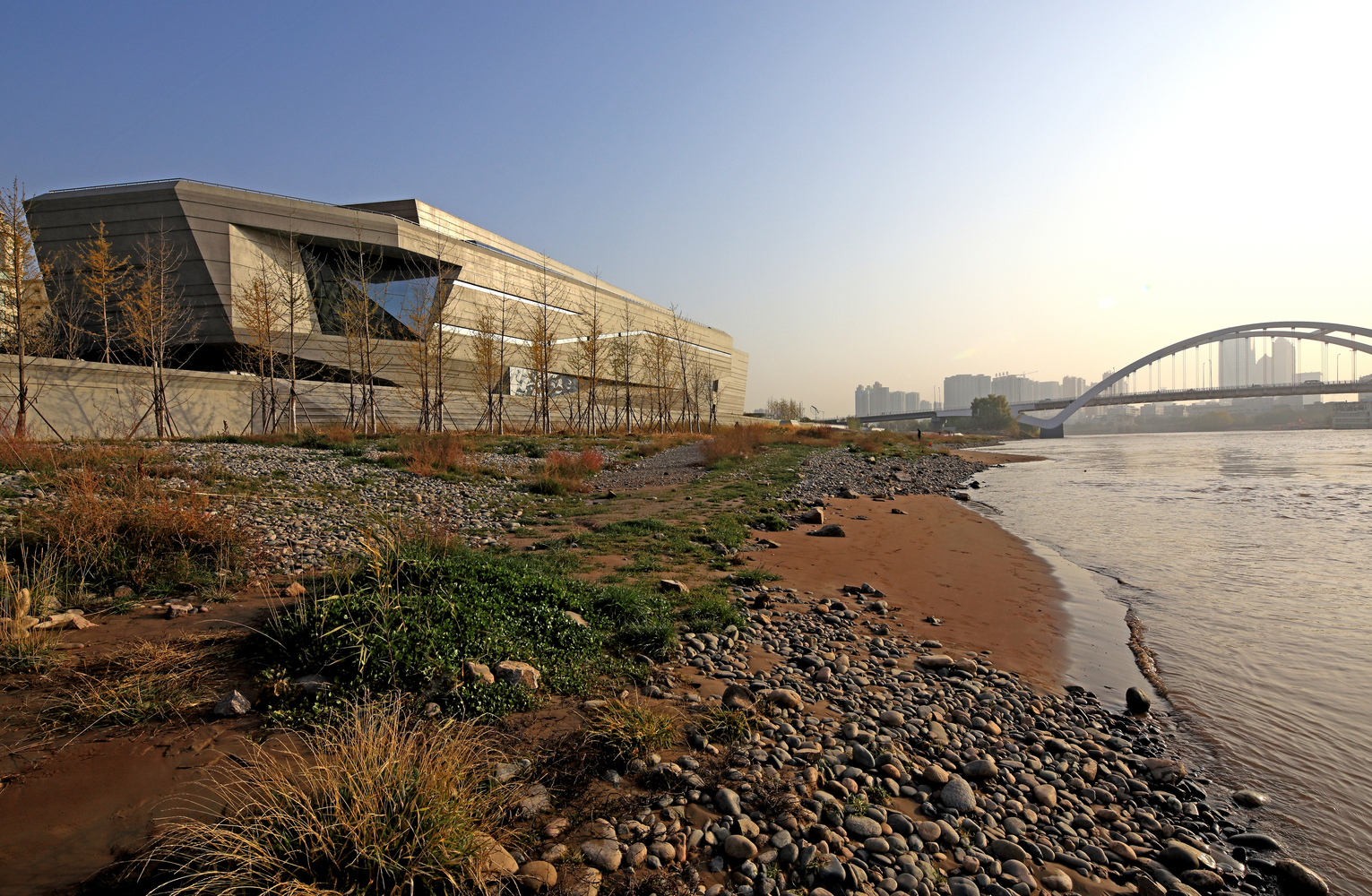 场地周边区域发展成熟,景观条件得天独厚。滨河绿带在基地内延伸。建筑南侧临水部分的设计作为一个重点,以自然的坡地形态,使滨河道路延伸至黄河河面,创造亲水的城市空间,使建筑与环境浑然一体。