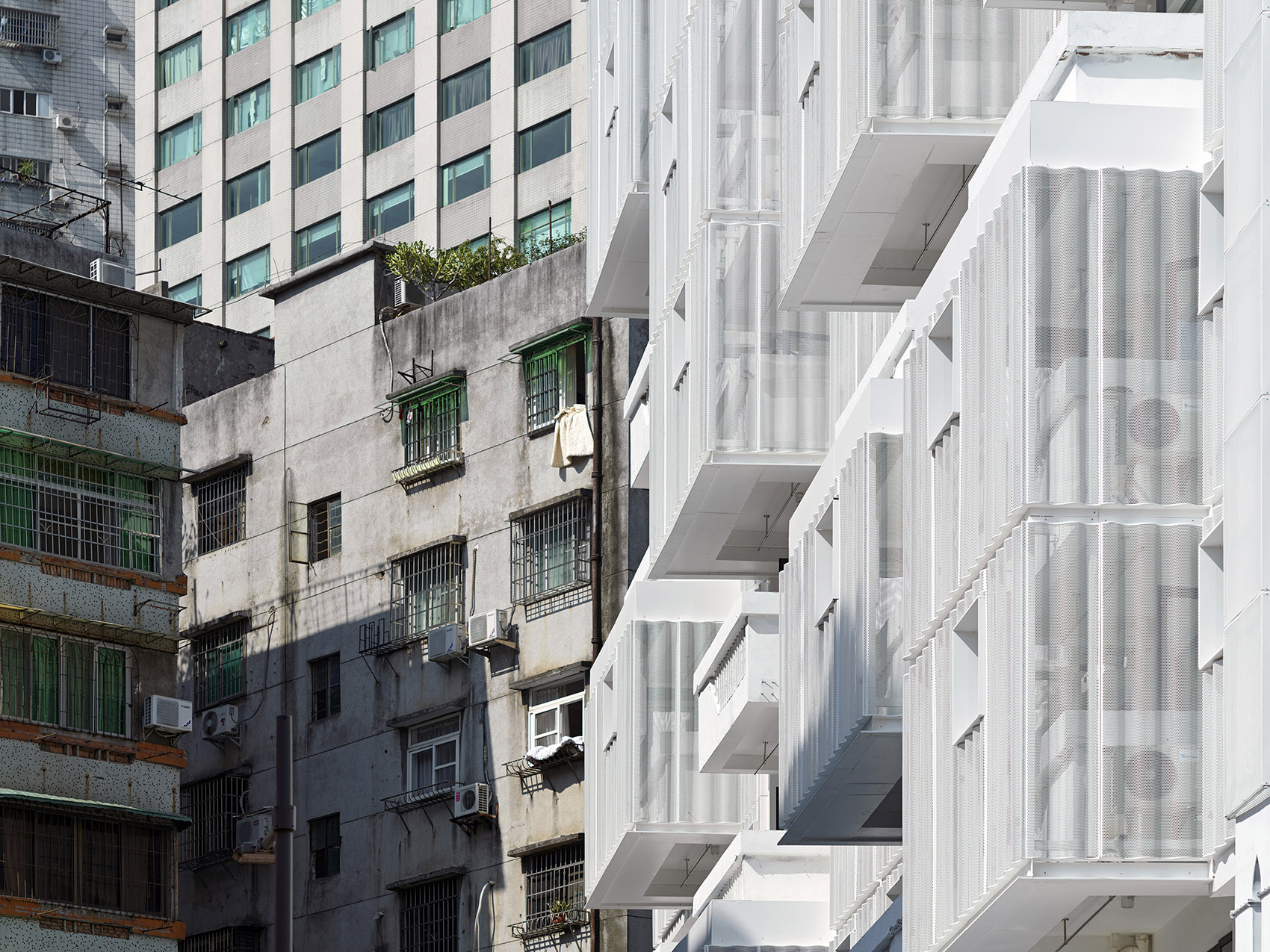 而背后与城中村内原有建筑的“对话”也突出了新与旧语言的对比,与周边大小建筑共生的状态强调了城市立面肌理层次的“拼贴”感。