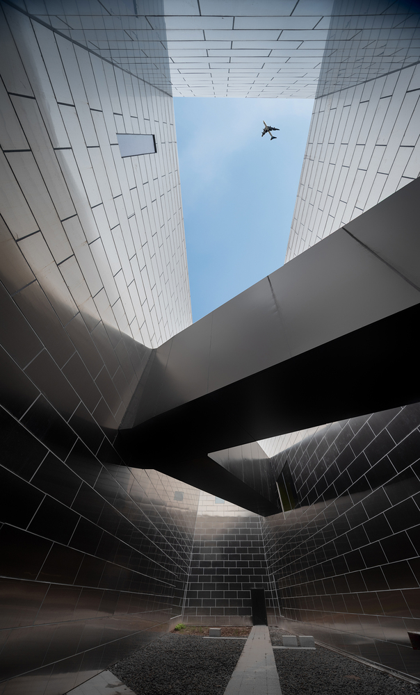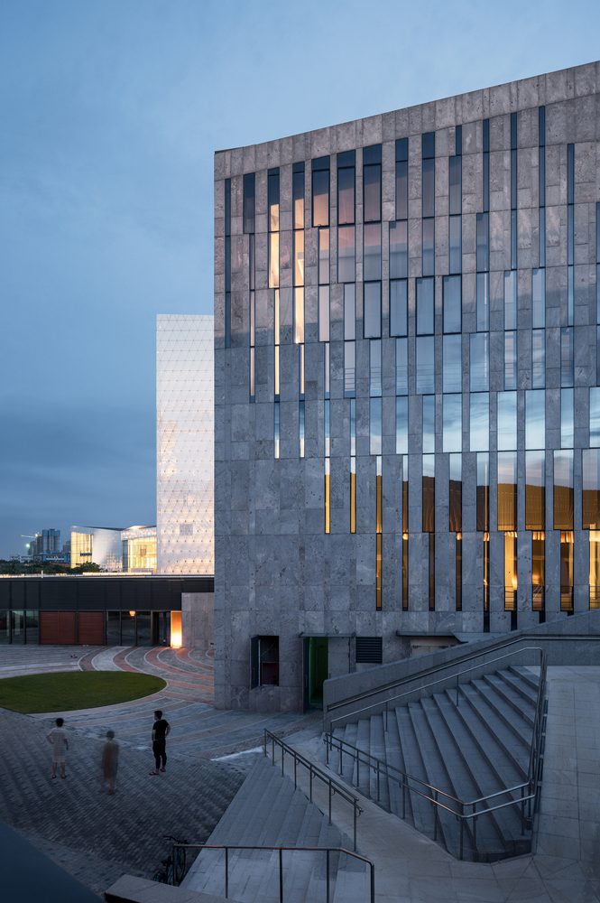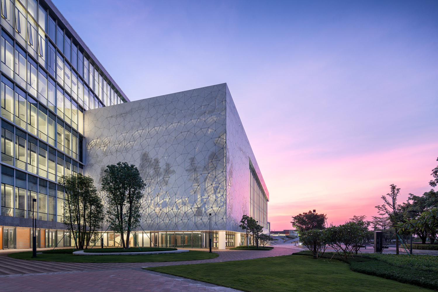 三⽔,因⻄江、北江、绥江三江在境内汇流⽽得名。它的⻘⼭绿⽔让⼈过⽬不忘,三⽔新城以⼭、⽔、岛、城、洲的规划理念更让⼈为之向往。三⽔新城⽂化商业综合体五栋建筑的⽴⾯⽤⼀副完整的⽔墨⼭⽔画绵延串联,既分亦合,远看建筑群跌宕完整,近观每栋单体建筑⼜又通过彩色丝网印幕墙(不同场馆具备不同的主题色,图书馆-绿;档案馆与城建展览馆-蓝;文化活动中心-红;科技馆-黄)展示⽅式增加场馆的可识性;各场馆各具特⾊易于分辨。同时,⽔墨画通过参数化的圆洞尺⼨和密度呈现,为了更加真实的模拟呈现宣纸的肌理,建筑师还特意跟幕墙设计师共同实践,创新性的把⾦属板材做了捶打效果,增加建筑表⾯光线的漫反射,减弱⾦属本身的强烈⾃反光。⽩天这幅⽴体的⽔墨⼭⽔画卷清晰可辨。