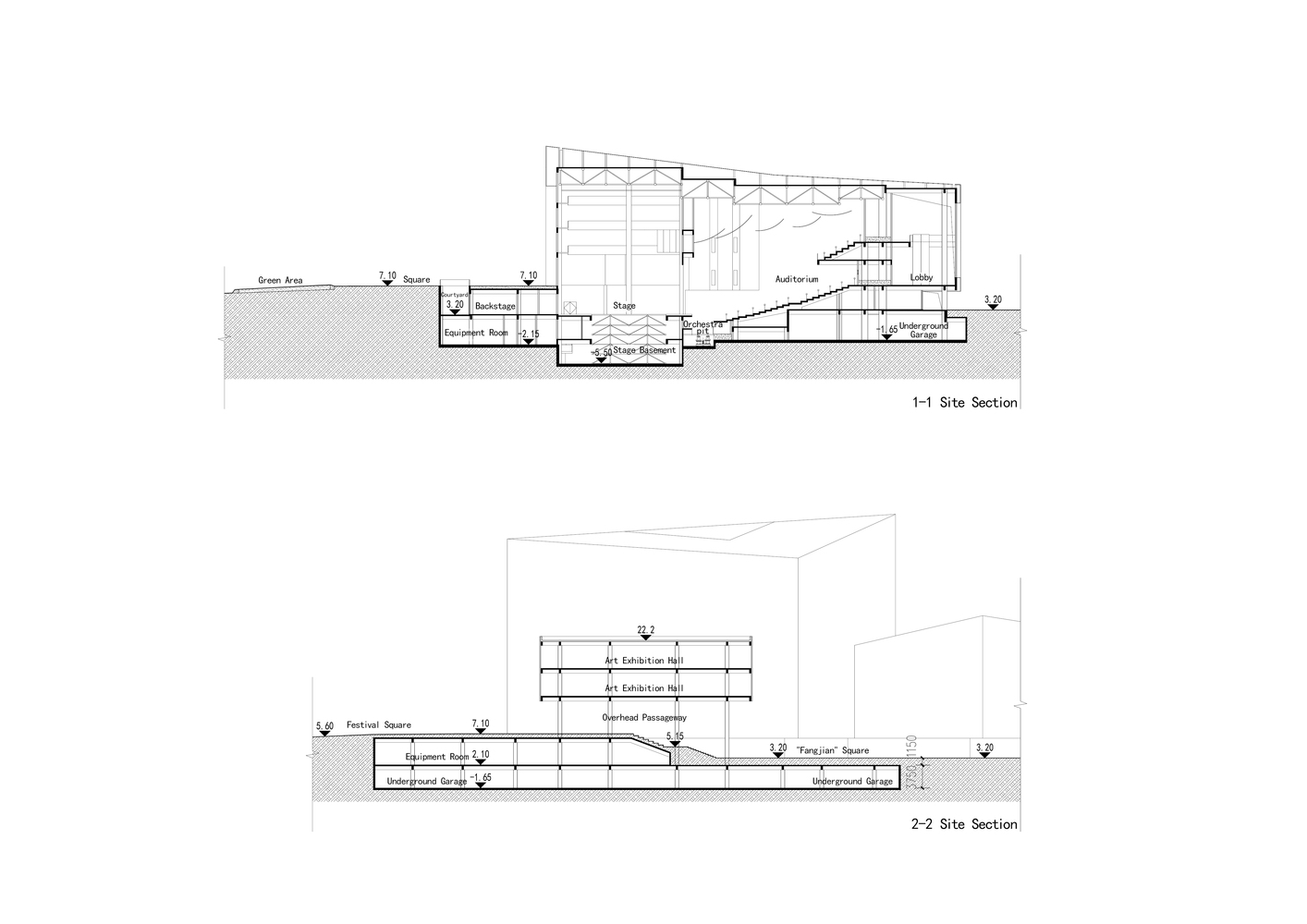 “超级地表”之下成为场馆的使⽤功能与商业的功能⽤房。由于场馆将近1/4的体量被置于“超级地表”之下,使得建筑师所控制的地⾯建筑尺度在后期深化中,即使业主对场馆的规模及内容作出了较⼤的调整后,仍能保持原设计体量感觉。最终真实实施的体量规模与概念阶段的,相差甚微。