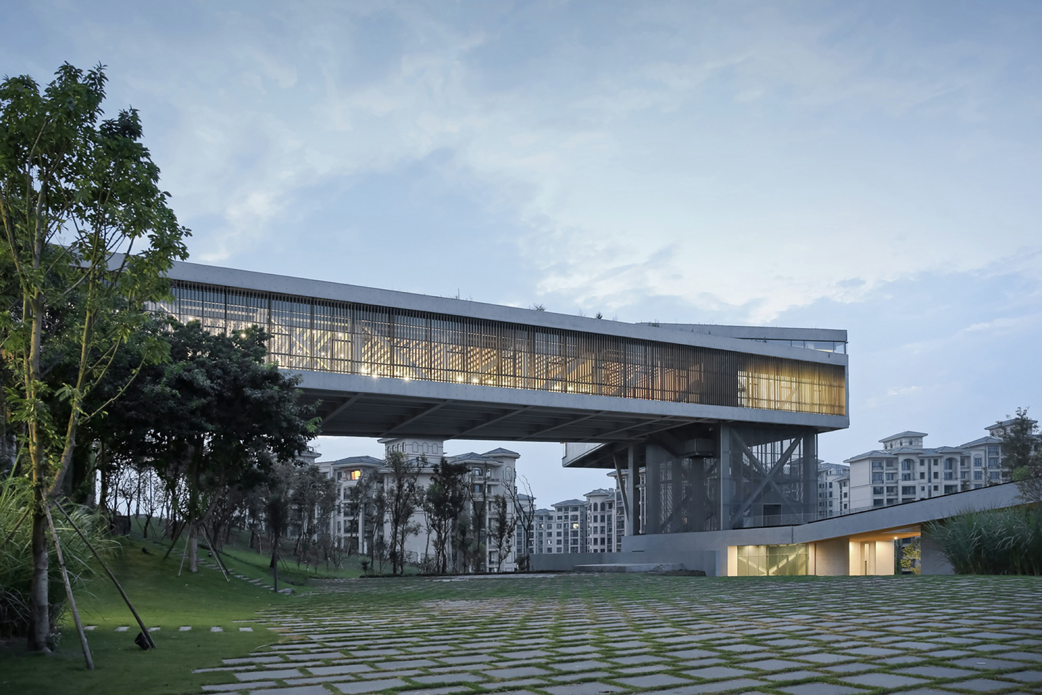 由于多雨气候的影响,重庆当地传统建造中存在着大量的类似“风雨骑楼”的半户外行走空间。这一空间类型也被延续到该社区中心户外空间串联的交通组织方式之中。两个庭院与建筑四周有多条线路相连接,并通过大尺度的洞口与架空,从视线和流线两个层面,将内外空间紧密联系在一起。