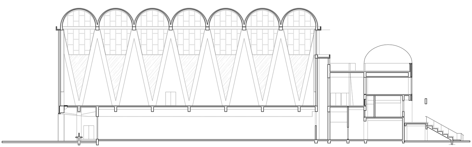 运动场地空间的屋顶和外墙,使用了一系列直纹曲面、筒拱及锥形曲面的钢筋混凝土结构,带来大跨度空间和高侧窗采光,在内明露木模混凝土筑造肌理,在外形成沉静而多变的建筑轮廓。达到建筑结构、空间与形式完美统一。
