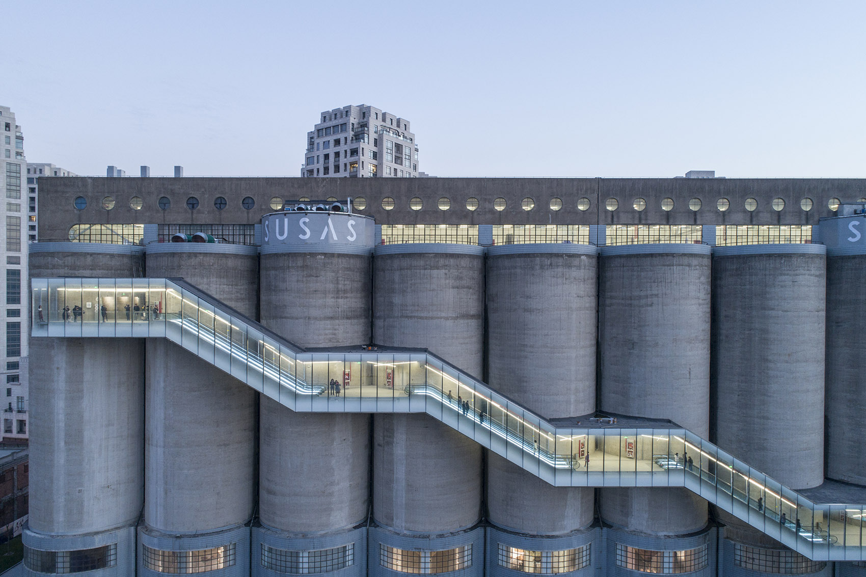 原有筒仓的建筑形式的超尺度和筒仓单元组合带来的视觉印象,恐怕任何新增的元素,都会制造出“违和感”,然而从最终的解决方式来看,形式的“和谐”并不是建筑师刻意去追求的。新增的100多米长的巨型外挂扶梯,加剧了新旧形式之间的冲突,直面现实并且不惧对抗。