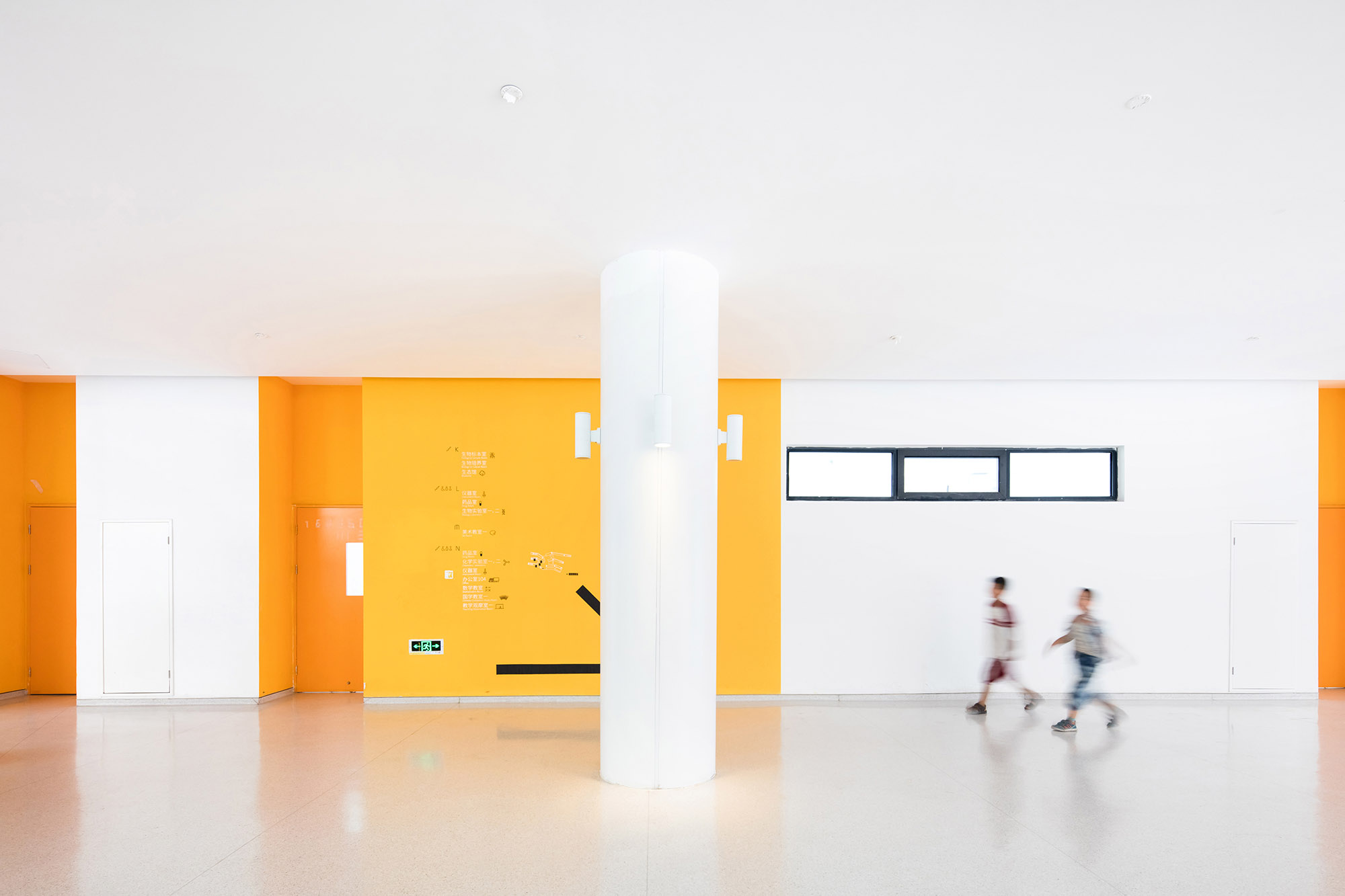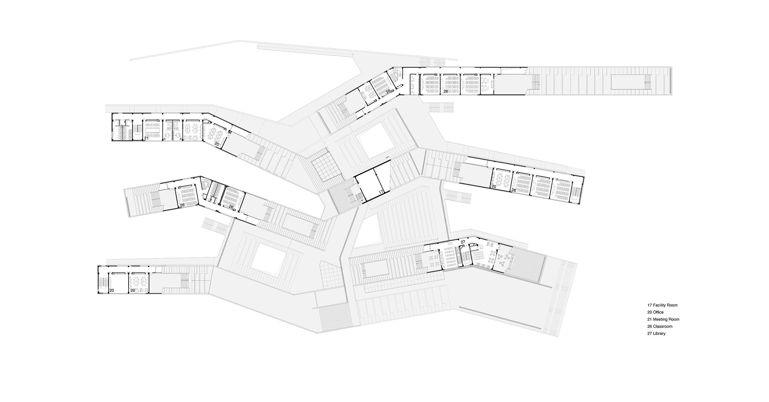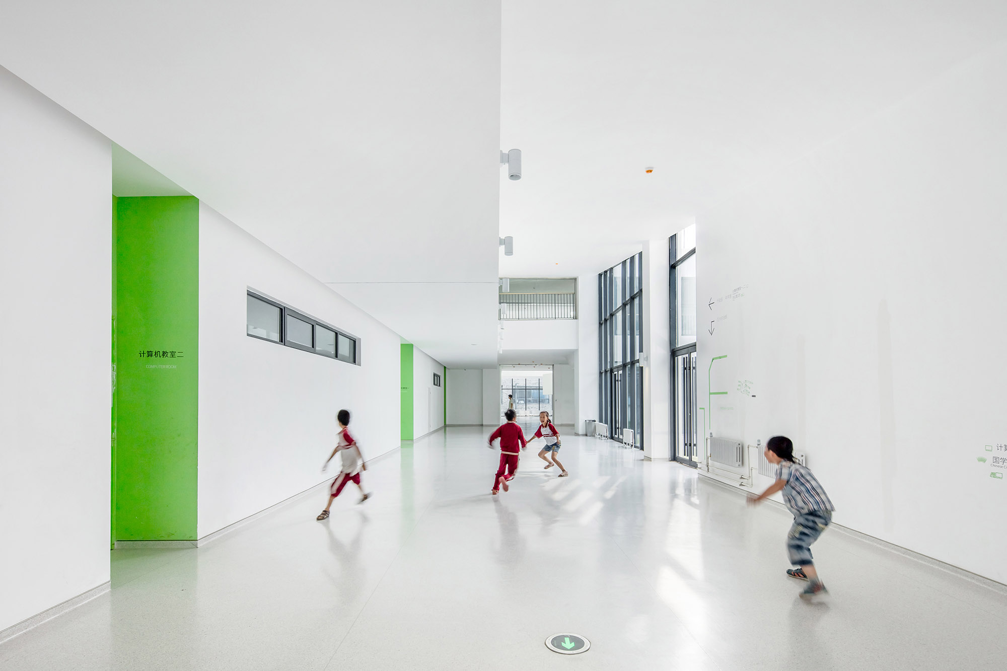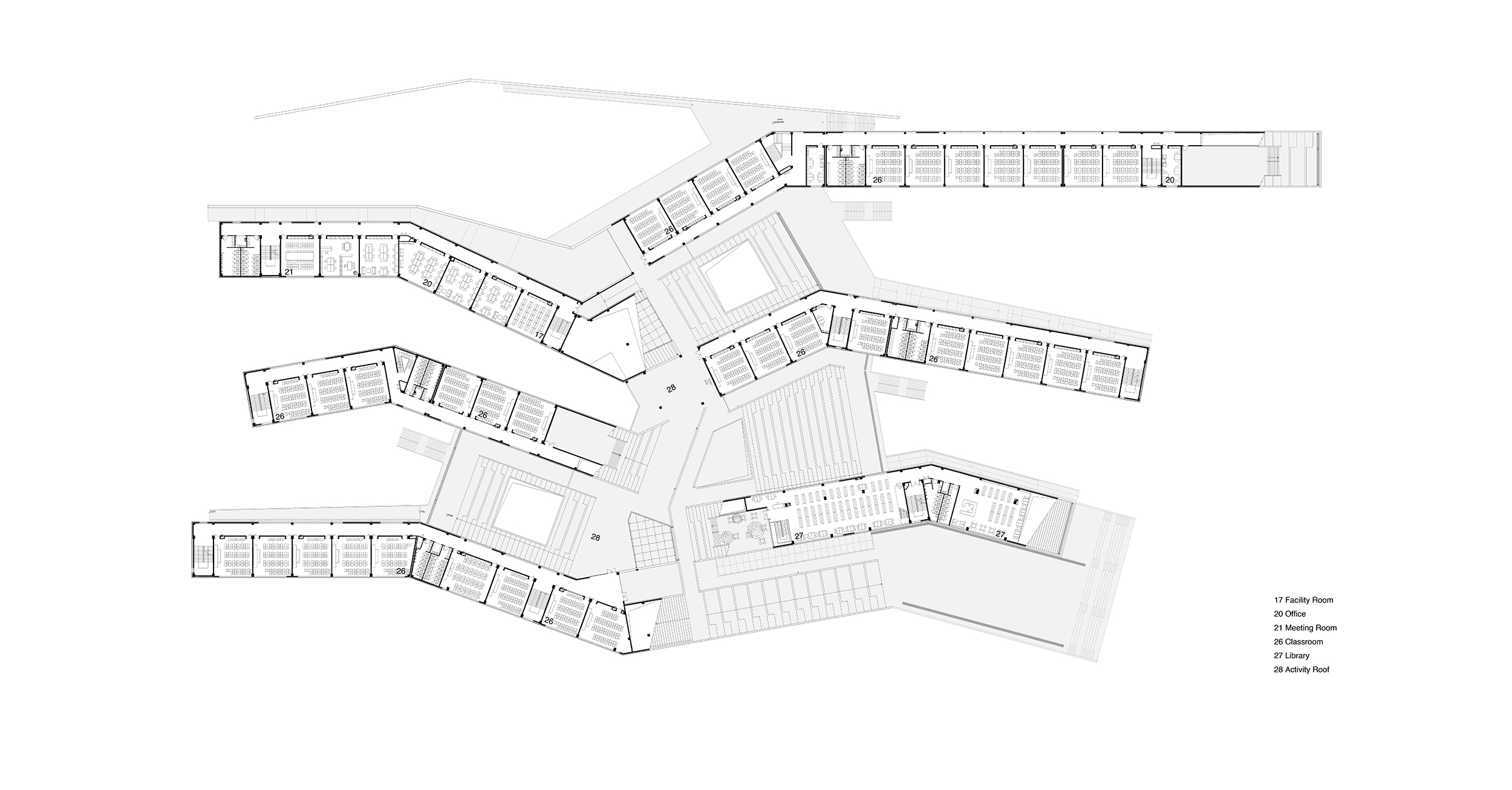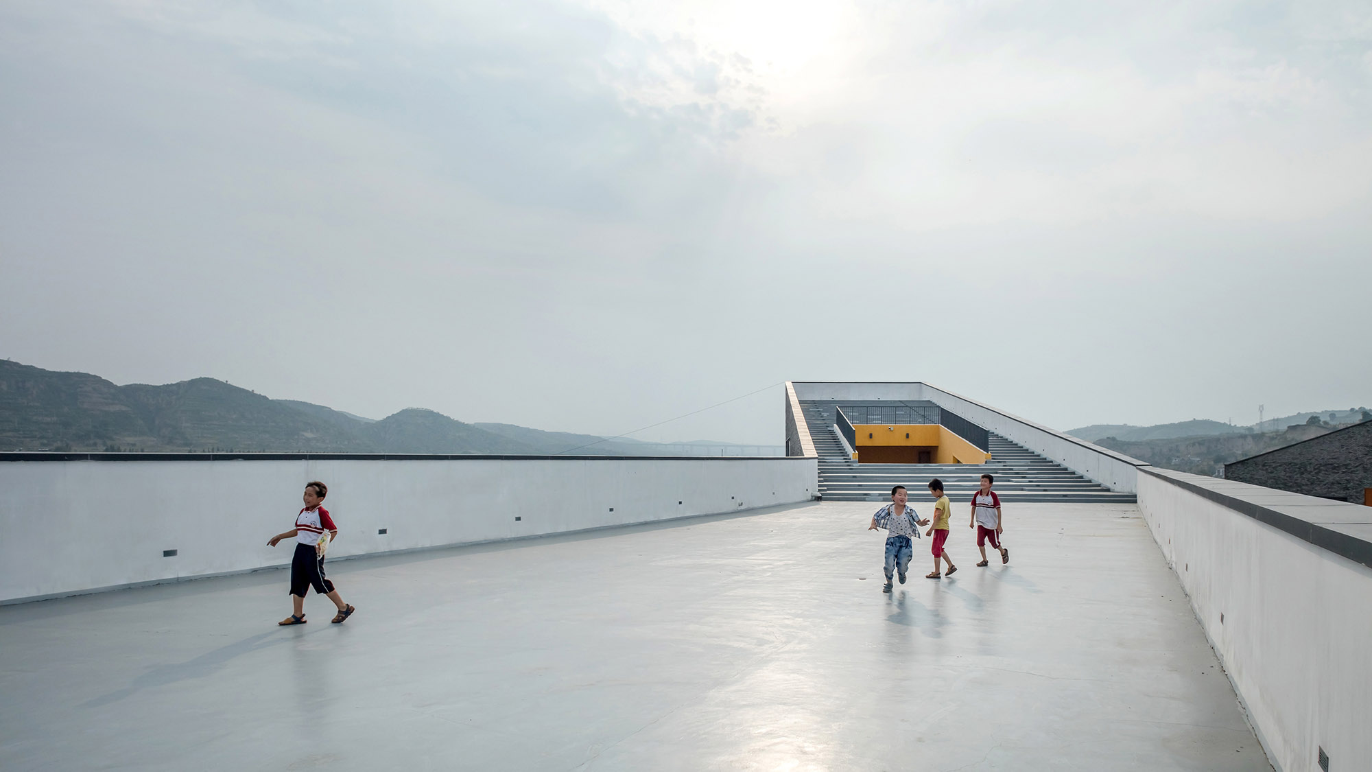 课堂教育之外的活动空间,在现代教育中显得尤为重要,建筑物从当地窑洞智慧取得启发,上一层用户充分利用下一层用户的屋顶为生活院子,为中国民居中高效利用空间的典范,教学楼每层公共空间均有通向屋顶的开口,在有限的课间活动时间使得学生非常便捷地使用屋顶平台空间,有效拓展学生课外活动场地。