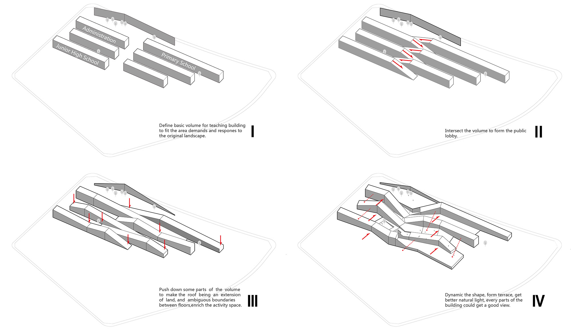 借助电脑模拟,优化建筑形体及开窗形式,建筑布局让夏季风顺畅通过校园,同时有效阻挡冬季寒风;前后错动形体有利于每个房间及活动场地均能享受到阳光。建筑形式向山西民居坡屋顶形式致敬。天窗及庭院设置,在寒冷冬季时期,学生在室内大厅活动感知自然变化。同时,庭院为雨水庭院,在夏季雨季时期可降低公共大厅温度。