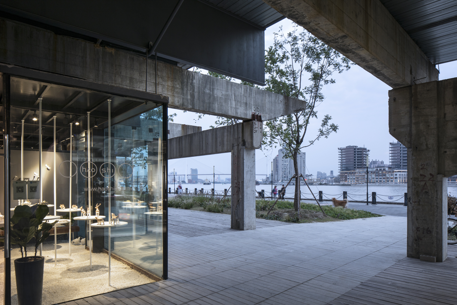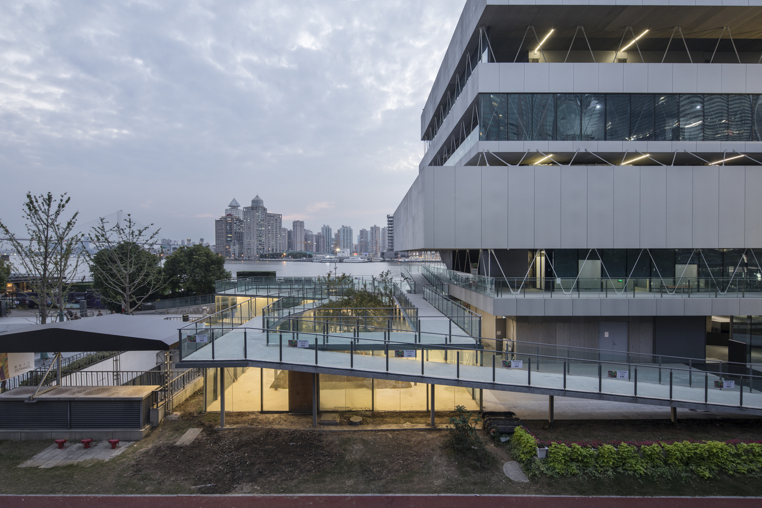 高架的步道、步道下的玻璃体艺术与服务空间、上下的楼梯、从一方水池上蜿蜒而过的折形坡道、直上三层的钢桁架大楼梯、在大楼梯中途偏折的连接艺仓美术馆二层平台的天桥、美术馆在闭馆后仍能抵达并穿越的各层观景平台与咖啡吧、穿过美术馆后南侧的折返坡道与公共厕所,都在构建独特的属于老白渡这个工业煤炭渡口区域城市更新后的公共性与新的文化形象。