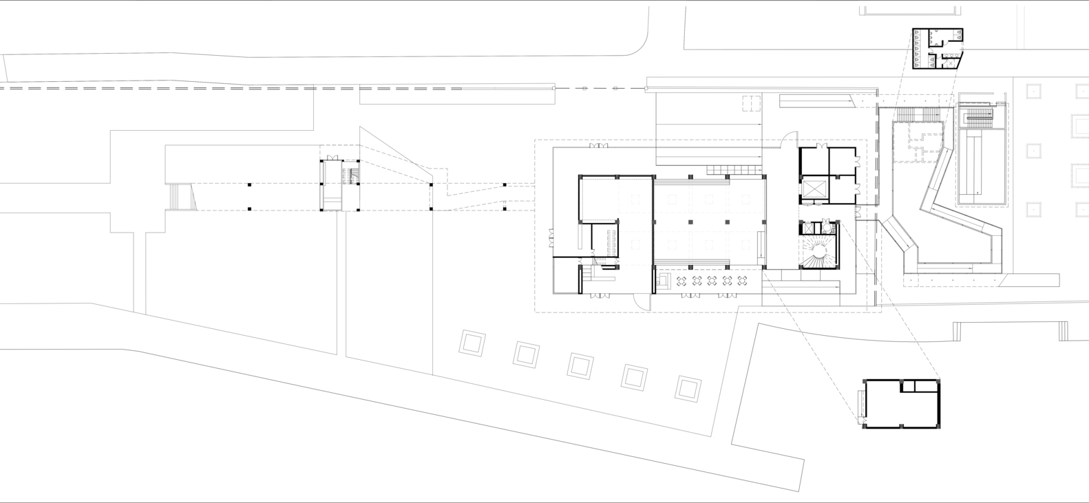 高架廊道也采用了悬吊钢结构系统,这个钢结构利用原有的混凝土框架支撑,既做为原有结构的加固和高处步行道的次级结构,又作为高架步道下点缀的玻璃服务空间顶盖的悬吊结构,这样这些玻璃体不再需要竖向支撑,在这种纤细轻巧的结构和原本粗粝的饱经沧桑的混凝土结构间呈现时间张力的同时,也获得了极好的视觉通透性,极大地保证了景观层面的空间感。