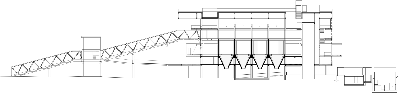 然而升级后的艺仓美术馆对于展览空间面积的需求远大于现有煤仓空间面积,为更好地组织空间,并极小地破坏现有煤仓结构,设计采用了悬吊结构,利用已经被拆除屋顶后留下的顶层框架柱,支撑一组巨型桁架,然后利用这个桁架层层下挂。