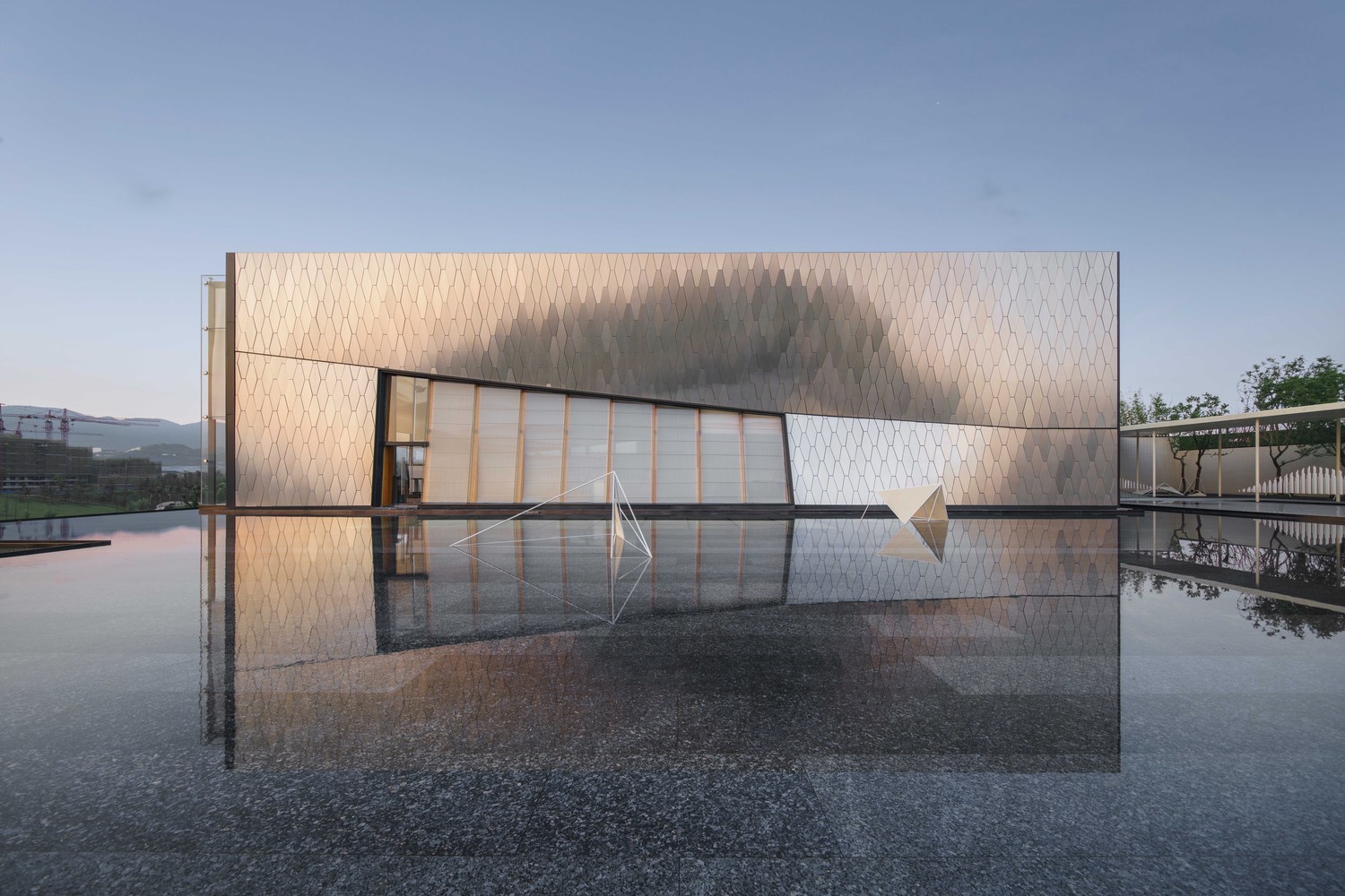 建筑师以六边形铝板作为主要界面材料,覆盖于内部结构之上。表皮顺应真实的建筑形态变化,每块蜂窝铝板精细包边,开缝拼挂,细节考究。数字化的表现手法营造出“Cyberpunk”(赛博朋克)的超时空现代感,表皮在自然光下形塑特质,追随光线的变化,产生复杂而神秘的视觉效果。