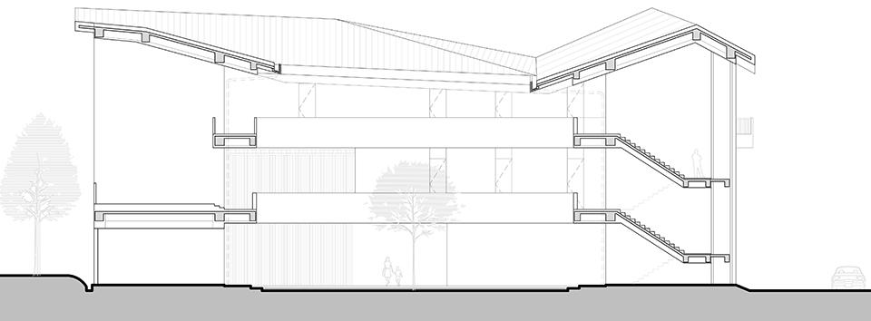 屋顶通过有序的曲折变化使建筑形态与对面的峡谷山体走势相呼应,同时充分考虑到在降雨量较大的时期迅速进行建筑排水。底层局部采用架空的设计手法,承袭当地杆栏式建筑特色,高低错落的隙间有效促进自然通风,同时丰富立面形态。