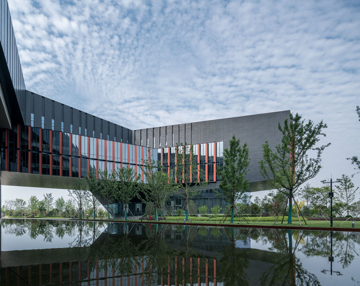沿着城市界面用深色大墙面做出干净的削切体型,这种关系一直延伸到屋面,再折到临湖面的墙体。顶部削切起伏延续了墙面做法,消隐掉了屋顶设备。从湖边高层望向汤逊湖时候,你会看见一个干净利落的中景,所有变化都收拢在散着金属光泽的深灰色体块转折中。