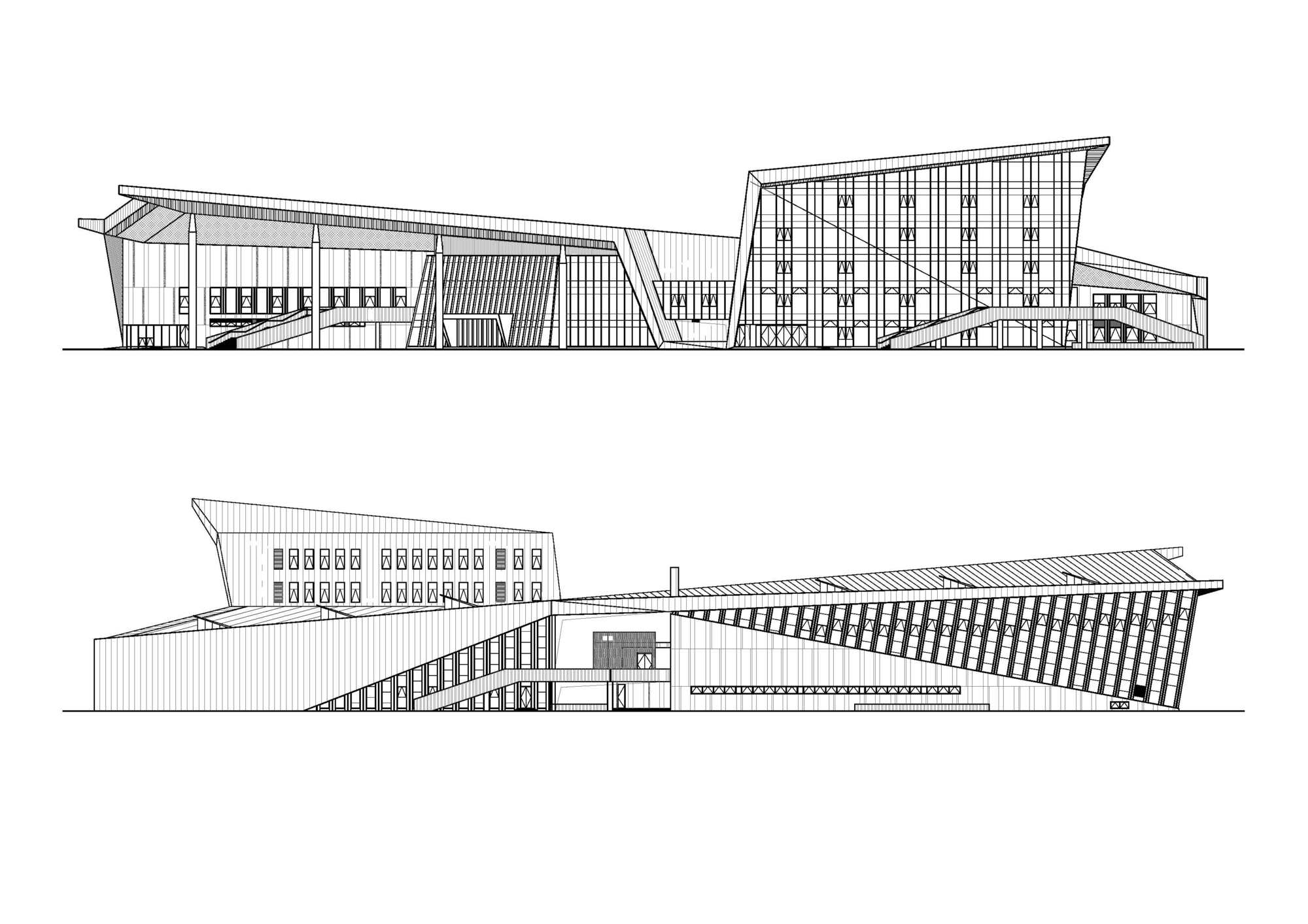 建筑师提出了设计一个巨大结构的想法,用巨大的动态屋顶覆盖各个不同的功能空间。建筑师利用折叠、起伏、修剪等方法满足了篮球馆、游泳馆、文化馆和多功能厅等空间不同的高度要求。同时,人们看这座建筑似乎是在看一座雕塑,它会给人强烈的视觉冲击。