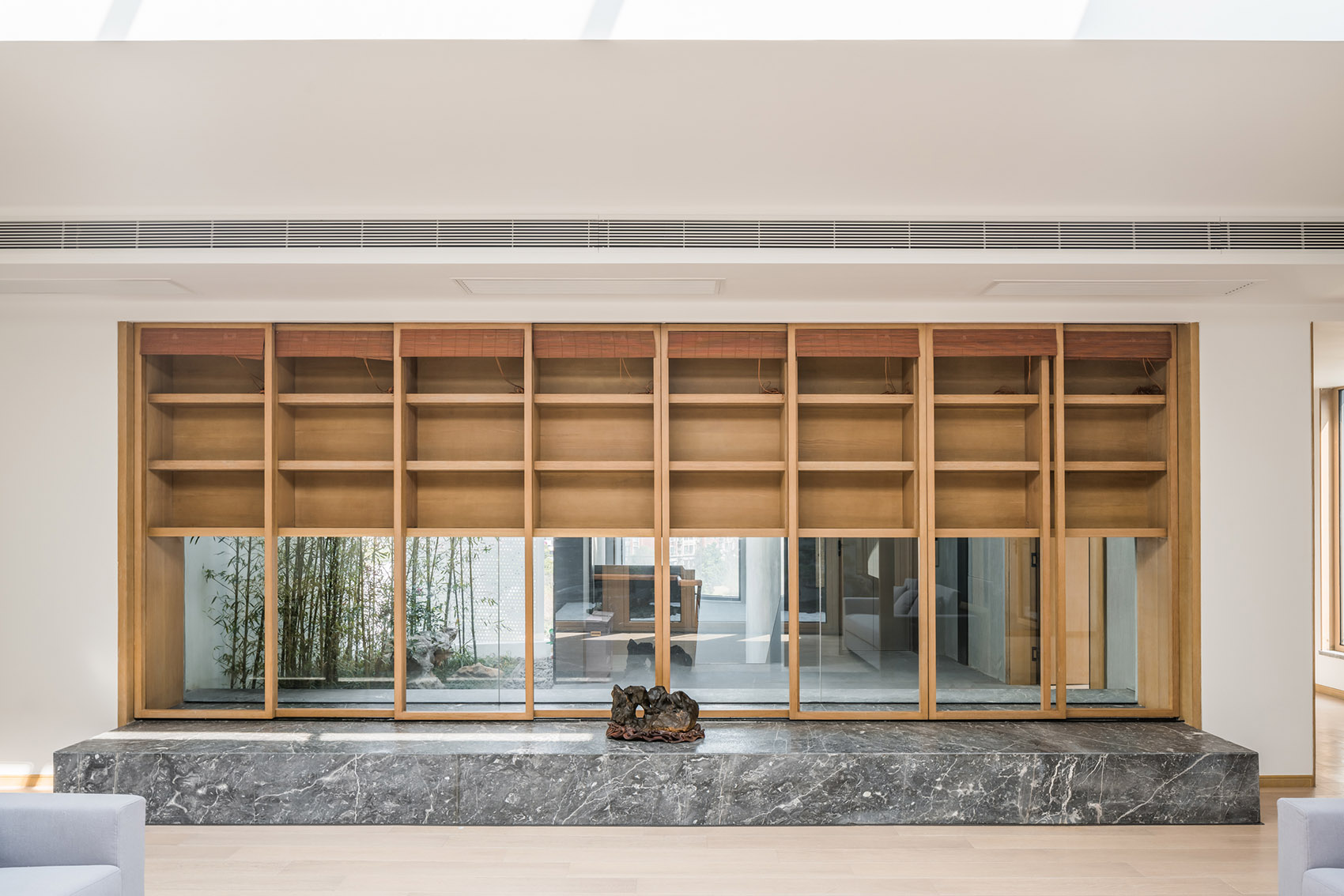 四层的民宿是隐藏在整个八分园的惊喜和高潮。每间民宿都有一个空中的院子,公共区域有一个四水归堂的天井。每个院子都是当代的中式庭院,取材于仇英的绘画而加以提炼,是一次关于垂直城市的实践,试图打造一个真正意义的空中别墅。