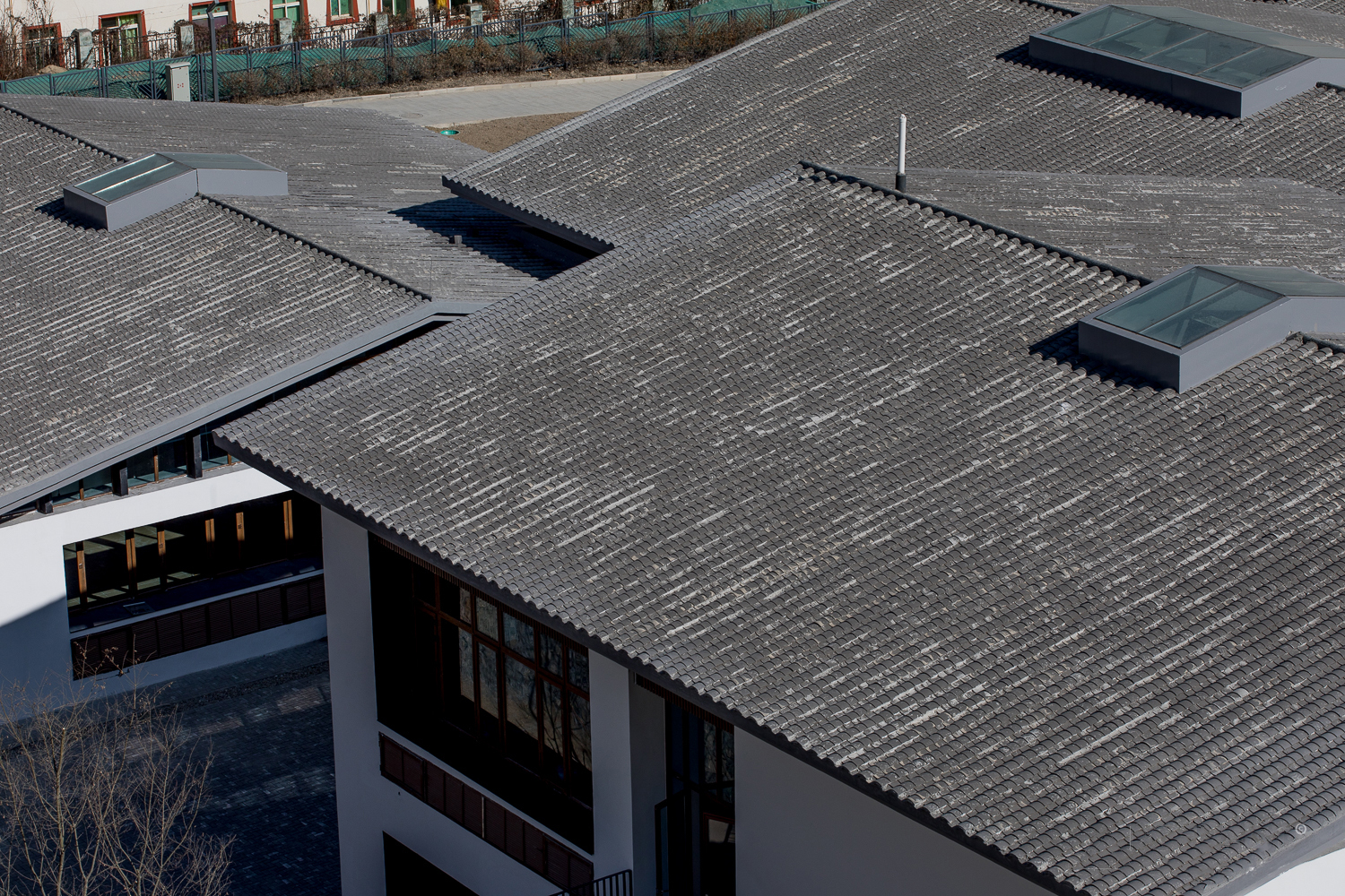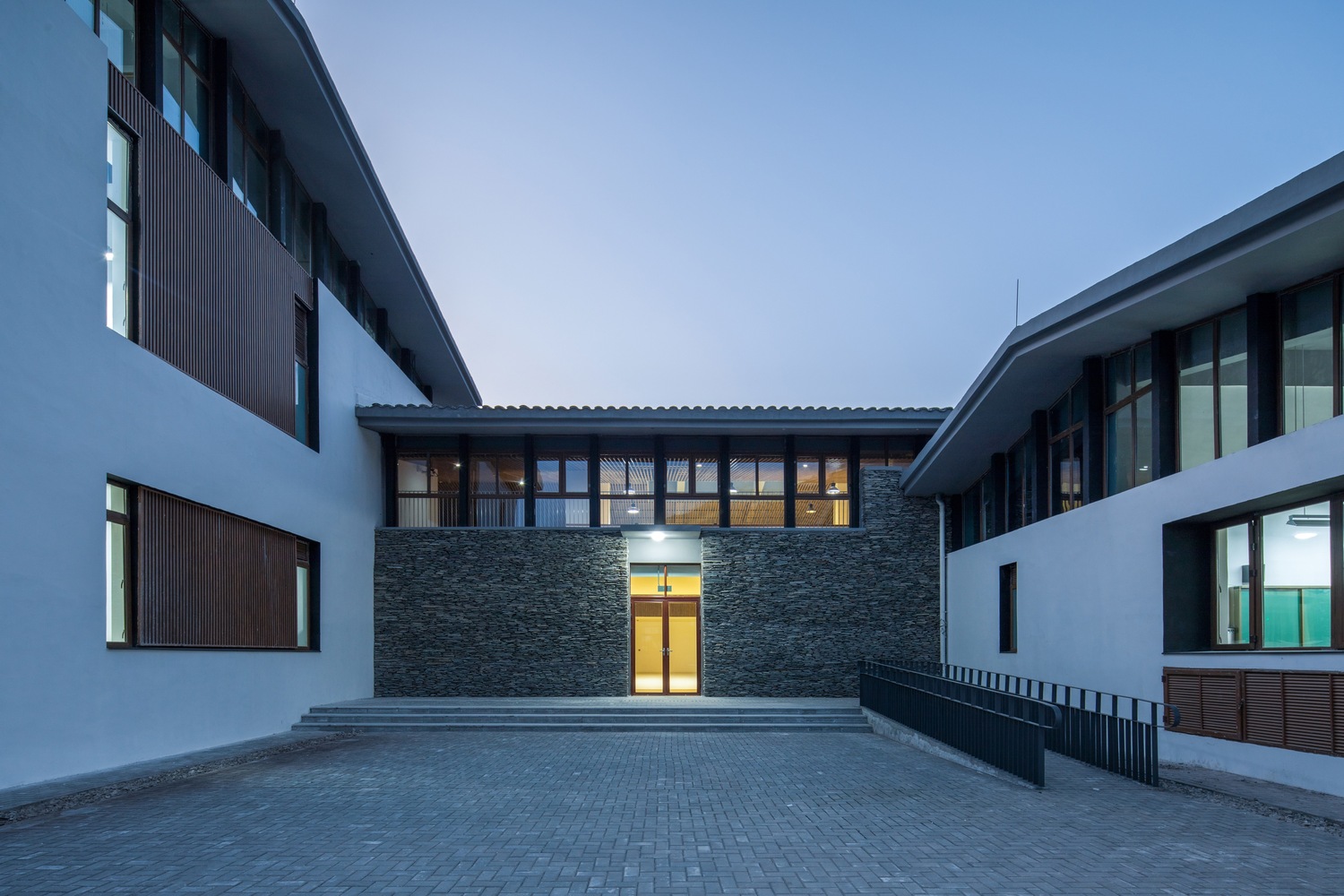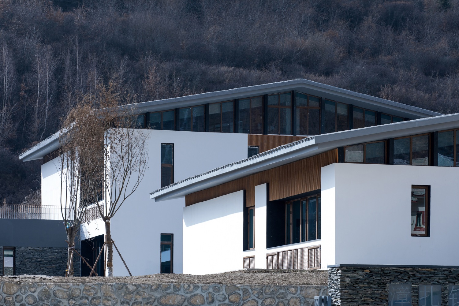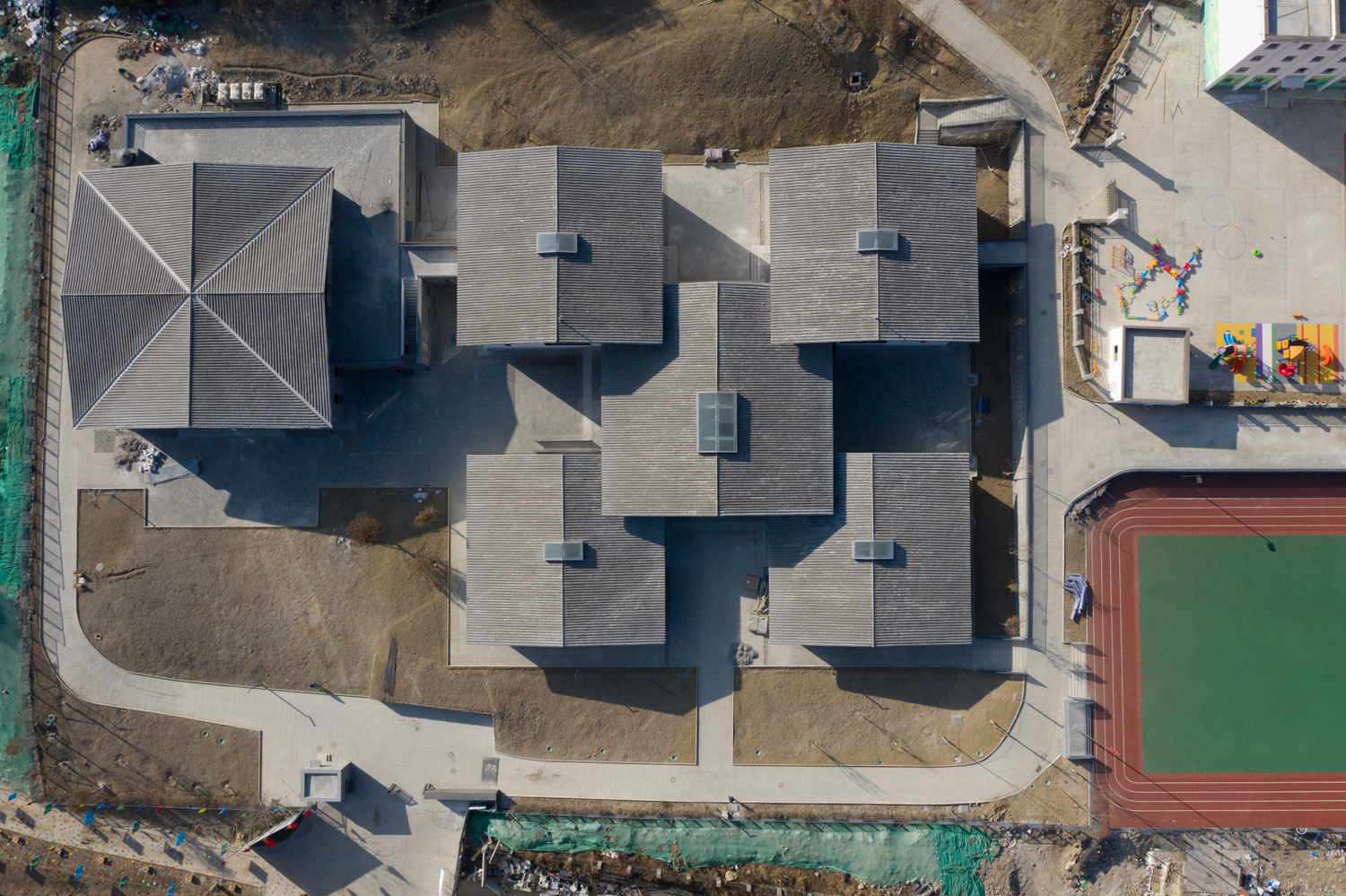 场地位于山地河谷,设计利用现有的缓坡地形,分别设置校园入口、教学区、运动场,三个不同标高的台地串联。我们借鉴当地藏族村寨的布局特点,将建筑拆分为多个坡屋顶体量的组合,山墙向阳,前低后高,层叠起伏的青瓦屋面与大山轮廓相呼应。建筑平面围合出多个半开放的三合院空间,将山景纳入其中,建筑与环境融为一体。