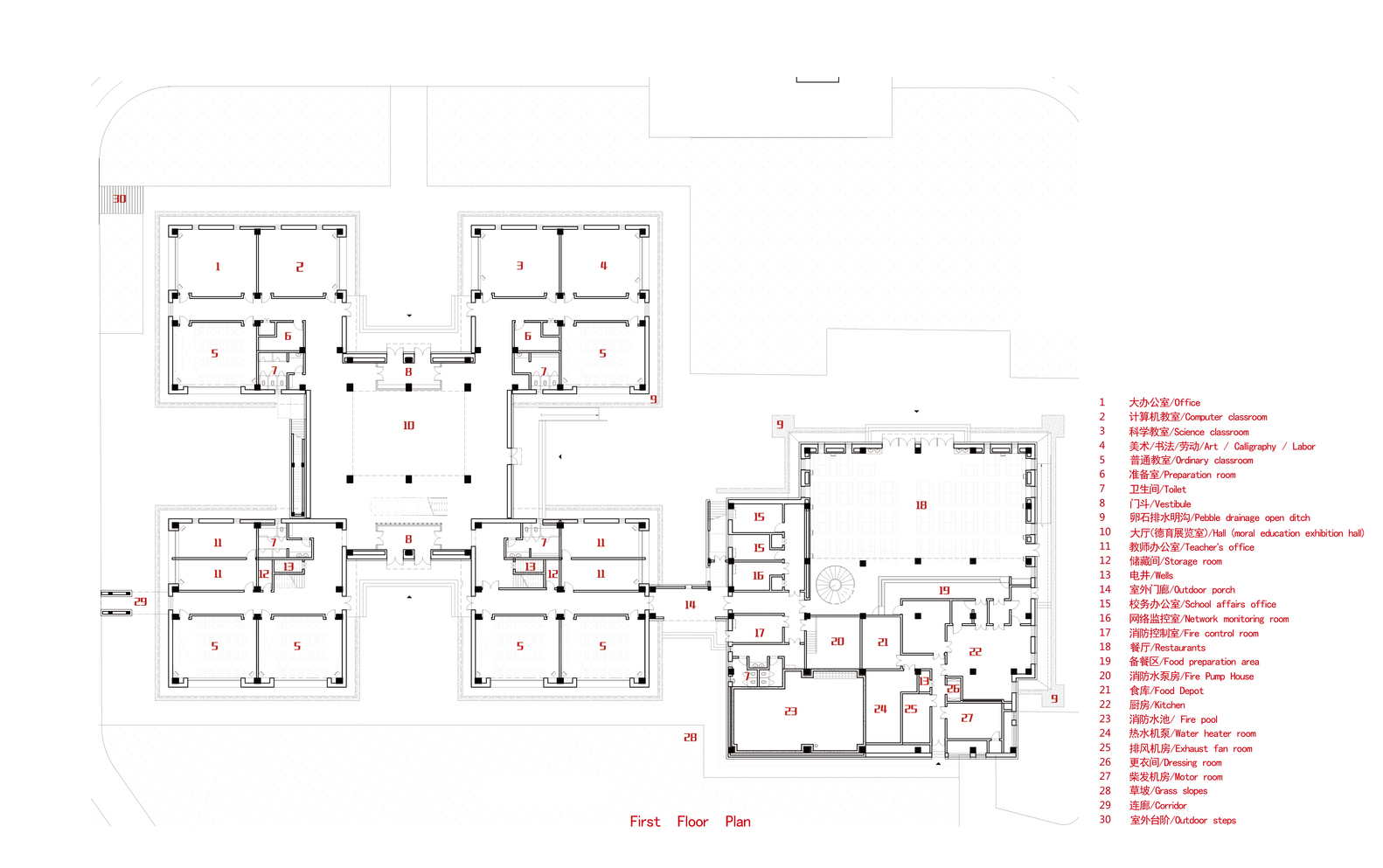 食堂图书馆作为一个单独的模块,采用了与教学楼双坡屋面不同的四坡十字形屋顶,内部两层空间上下连通,增强功能的开放与互动。