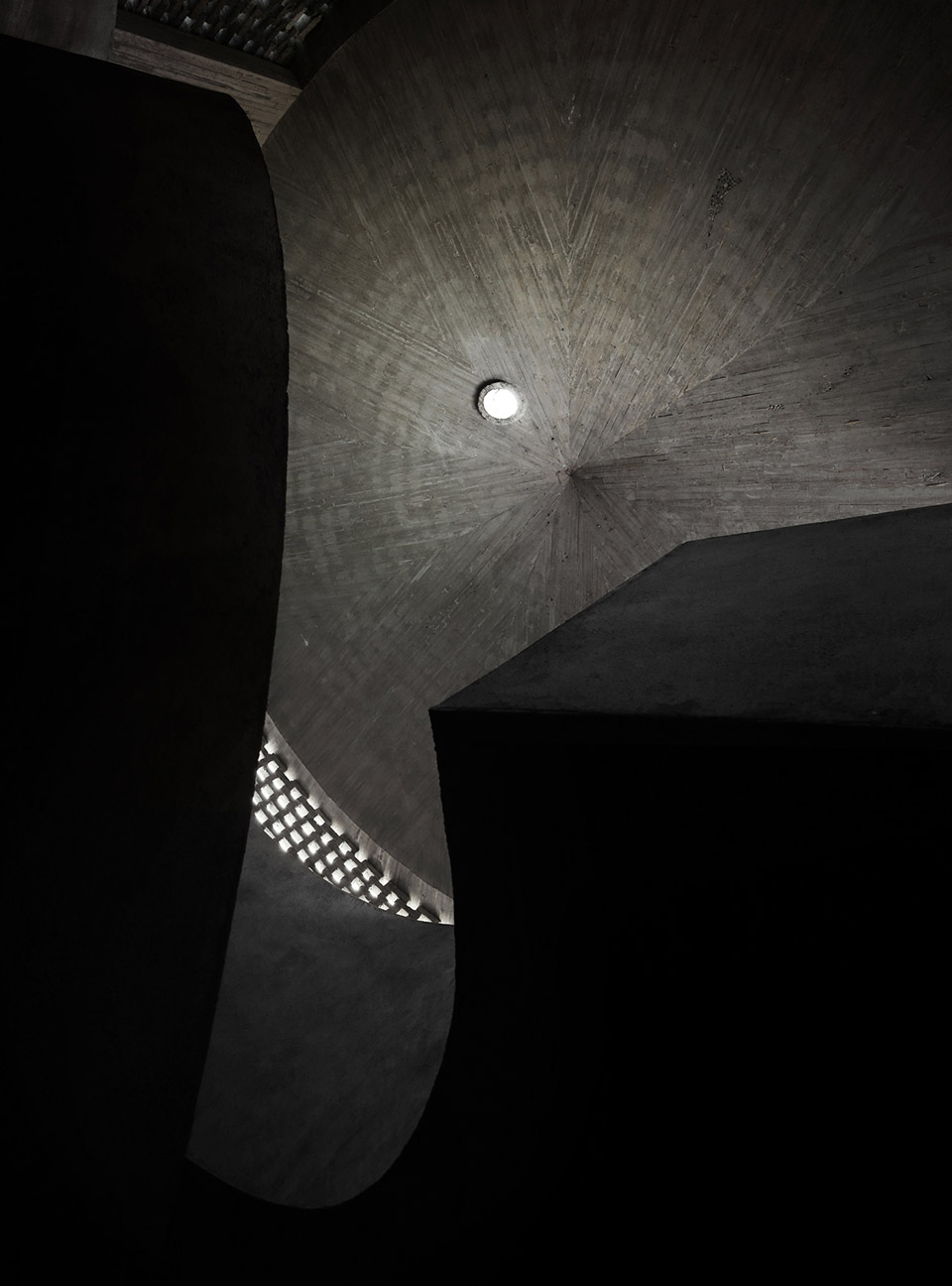 我们将整个场地视为一个可游走的空间系统:老糖厂、工业桁架与新体量在其中共同界定出或封闭或开敞的空间。在标准客房楼体内部,作为水平游走系统在垂直向度的延伸,一条1.25米的公共步道沿着楼体外部界面向斜上方绵延展开。公共步道系统独立于水平向的客房功能走廊系统。受喀斯特地形地区挖进山体的山道系统与溶洞启发,渐渐爬升的线型公共步道串联起三个带有强烈空间指向性的“溶洞”空间。三个“溶洞”在不同高度上呈现出不同的与自然山体岩石的对景关系,漫步于度假酒店中,人们可不断体验到空间明与暗、高与矮、远与近。