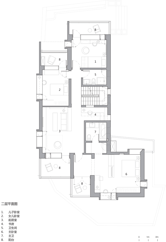 新的结构介入使房屋的空间格局得以重新调整,原有的砖墙可以适当地被拆除或移位:我们将原有一二层临海的两个卫生间移动到了靠近邻居家的一侧,在改善通风和采光情况的同时,也使客厅、餐厅与主卧室获得了更好的观赏海的视线。
