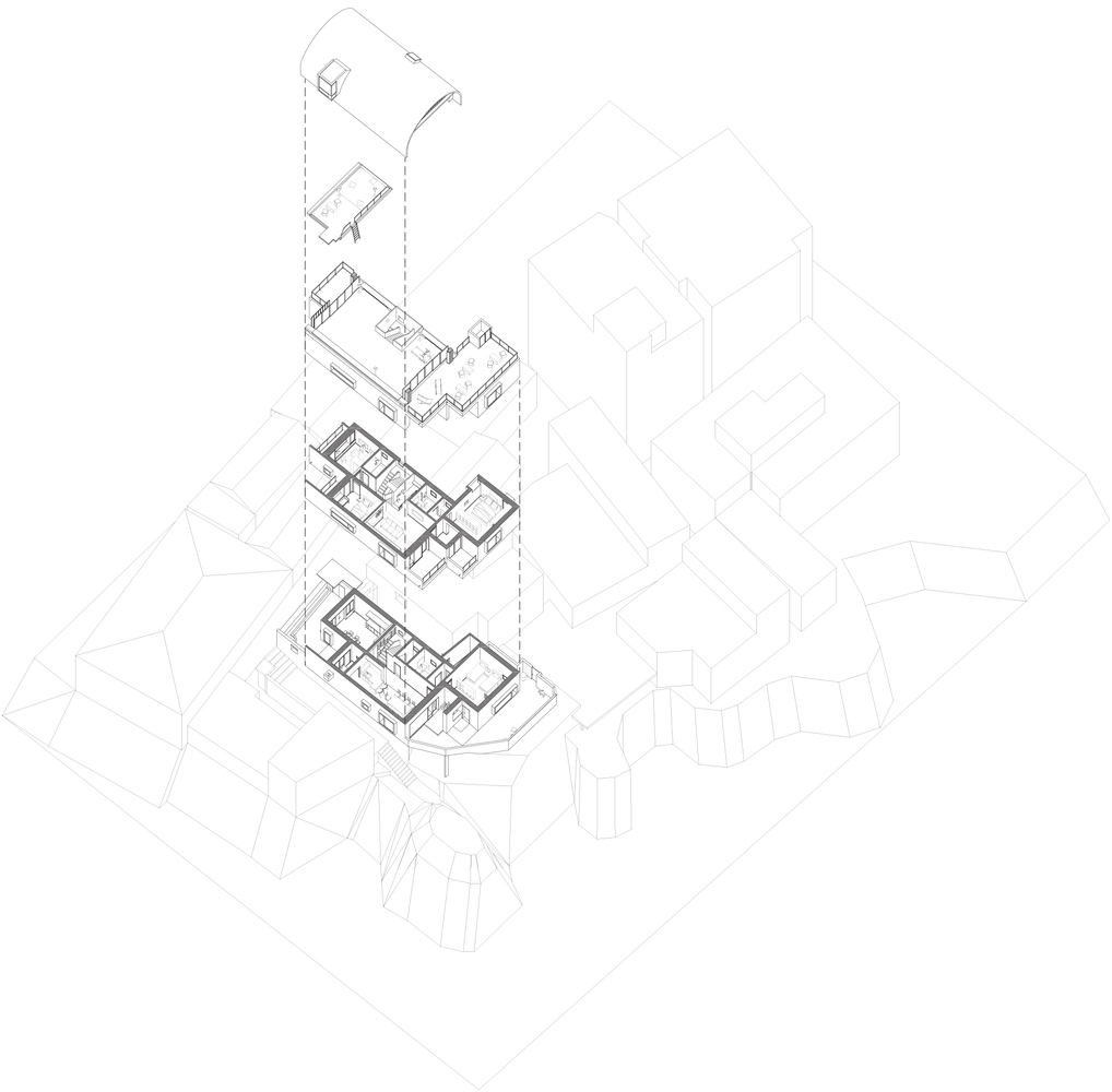 我们选择拱作为三层的结构形态出于几个主要原因。它是两边承重墙向上汇聚自然生成的结果;它的形态有利于屋顶的迅速排水,最大程度地降低了漏水和渗水的可能性;它天生具有方向性,在空间两端连接了两片性格迥异的海,人置身其中视线一边是喧嚣的港口,一边是宁静的大海。船长一家信仰基督教,三层的拱也蕴含了宗教空间的隐喻,相对于一二层的生活空间更具有精神意义。