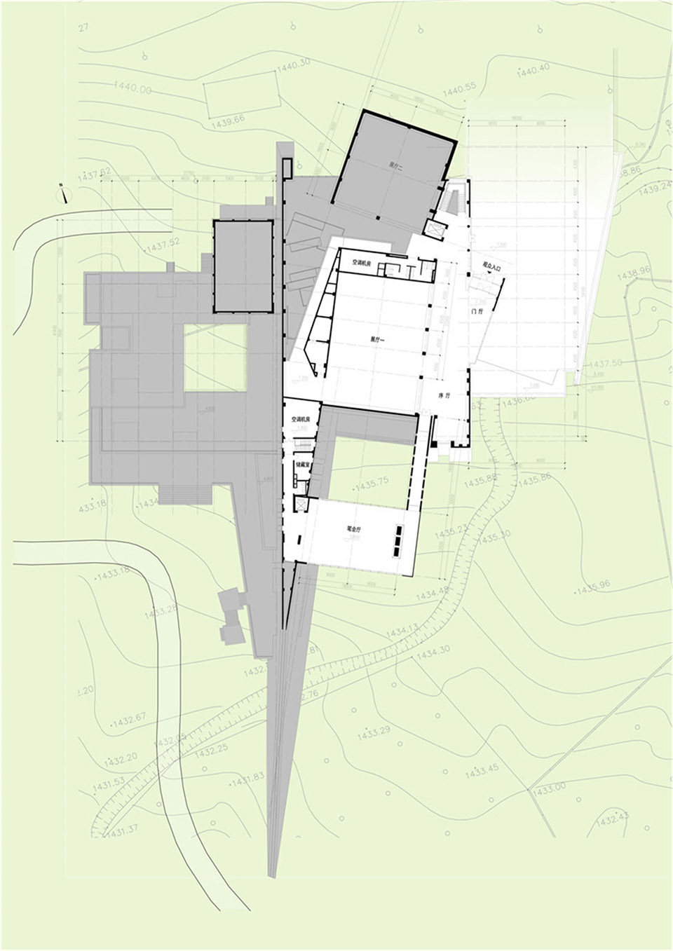 为确保苍茫雄浑的场所特征,我们利用山势高差,将建筑整体嵌入山体。具有当地原始肌理的砌石墙体宛如自然天成,墙体间的“缝隙”承载建筑的主要功能。以清水混凝土构建的三个平台,仿佛搁置于原始地貌之上,营造出苍野大地间的安全领域感。